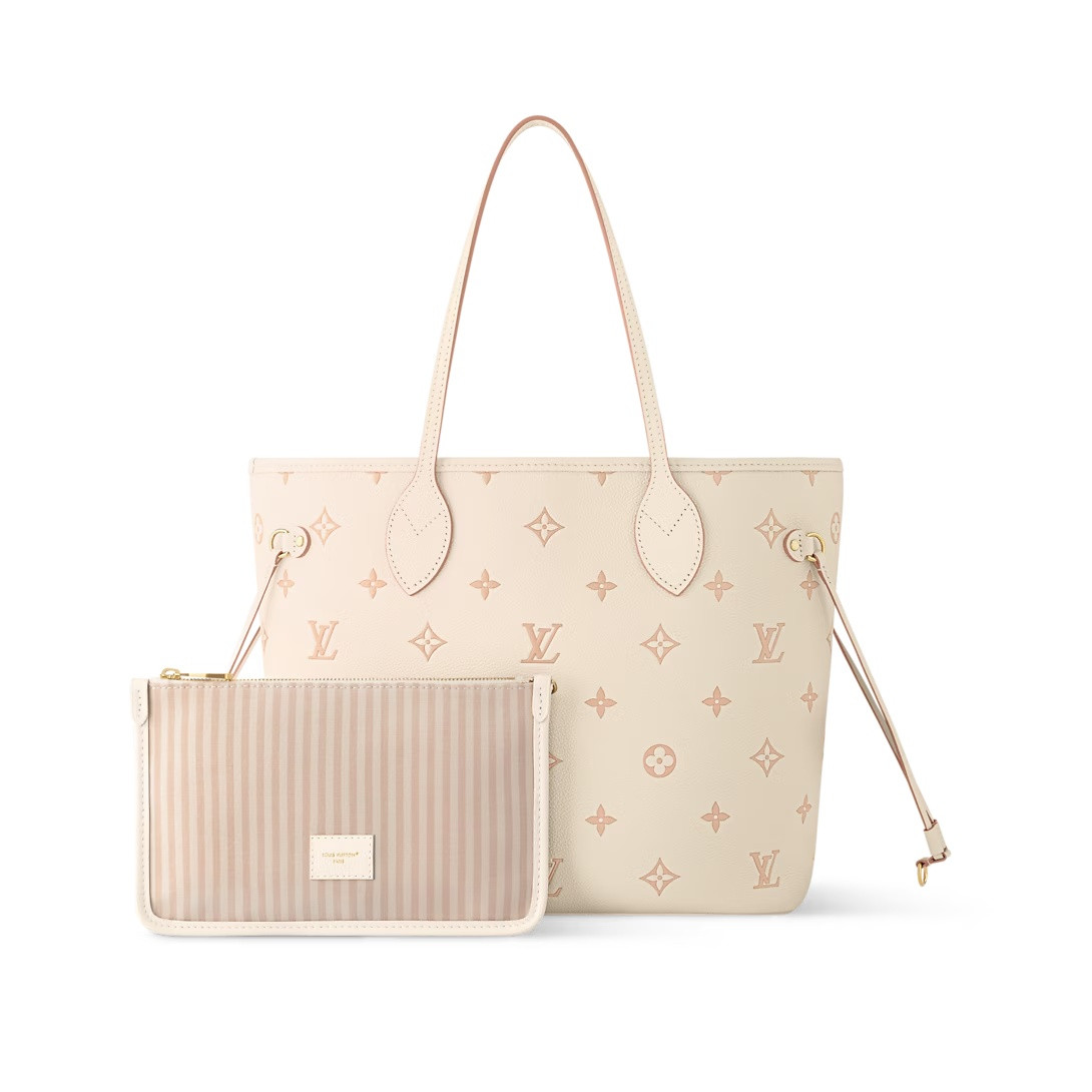 This Neverfull MM handbag features a reinterpreted Monogram Empreinte leather with a tonal and contoured Monogram motif. Equally functional and elegant, it offers space for a laptop and everyday essentials. A removable fabric pouch with a contrasting motif adds functionality, and gold-tone metal hardware completes the design with elegant accents.
