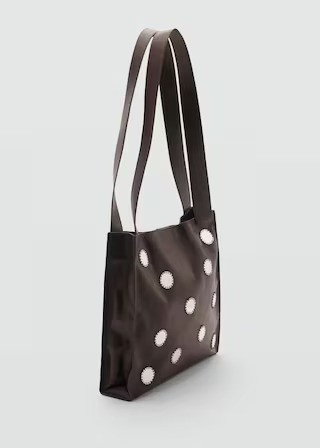 100% cowhide leather. Double handle. Two long handles. Square design. Metallic mirror appliqué. Magnetic closure.