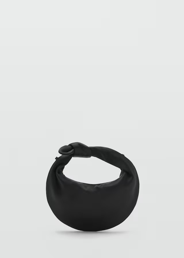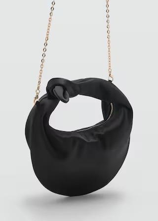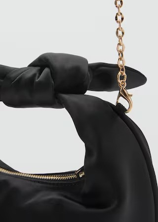 Medium size. Satin fabric. Handle. Decorative knot. Detachable chain strap. Inside pocket. Zipper closure. Lining.
