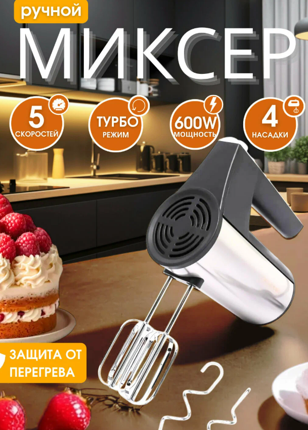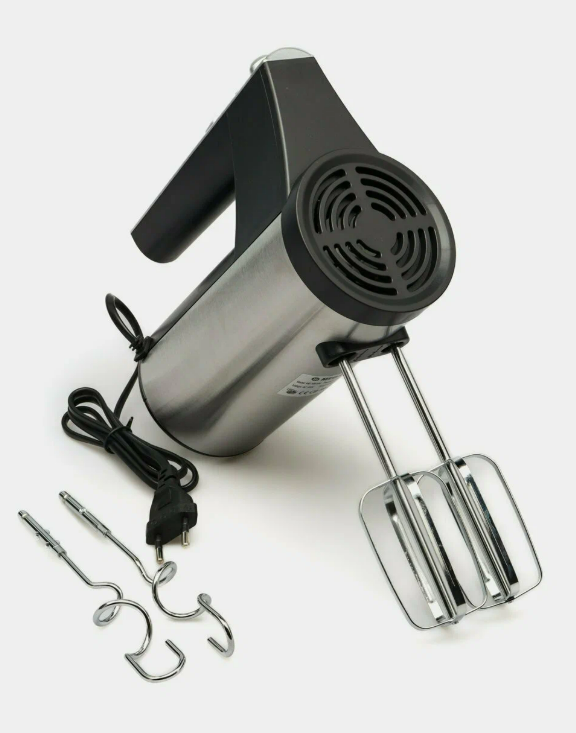 Manual Mixer Operation and maintenance instructions Operation Preparation: Plug the mixer into an outlet. Usage: Insert the desired nozzle into the mixer until it clicks. Place the ingredients in a bowl. Select the speed using the slider. Use the mixer by holding its handle and dipping the nozzles into the ingredients. Safety: Do not turn on the mixer without ingredients. Do not immerse the mixer body in water. Disconnect the mixer from the mains before cleaning and changing the nozzles. Care Cleaning after use: Disconnect the mixer from the mains. Remove the nozzles and rinse them with warm water and soap. Wipe the mixer body with a damp cloth, avoiding water entering the engine compartment. Washing: The nozzles can be washed in the dishwasher. It is recommended to wash the mixer body and handle manually. Drying: Make sure that all parts are completely dry before storage. Storage: Keep the mixer in a dry and clean place. Do not twist or bend the power cord. Recommendations: Check the nozzles regularly for damage. Avoid overheating, let the mixer cool down after prolonged use. Following these instructions will ensure the durability and reliability of your hand mixer.