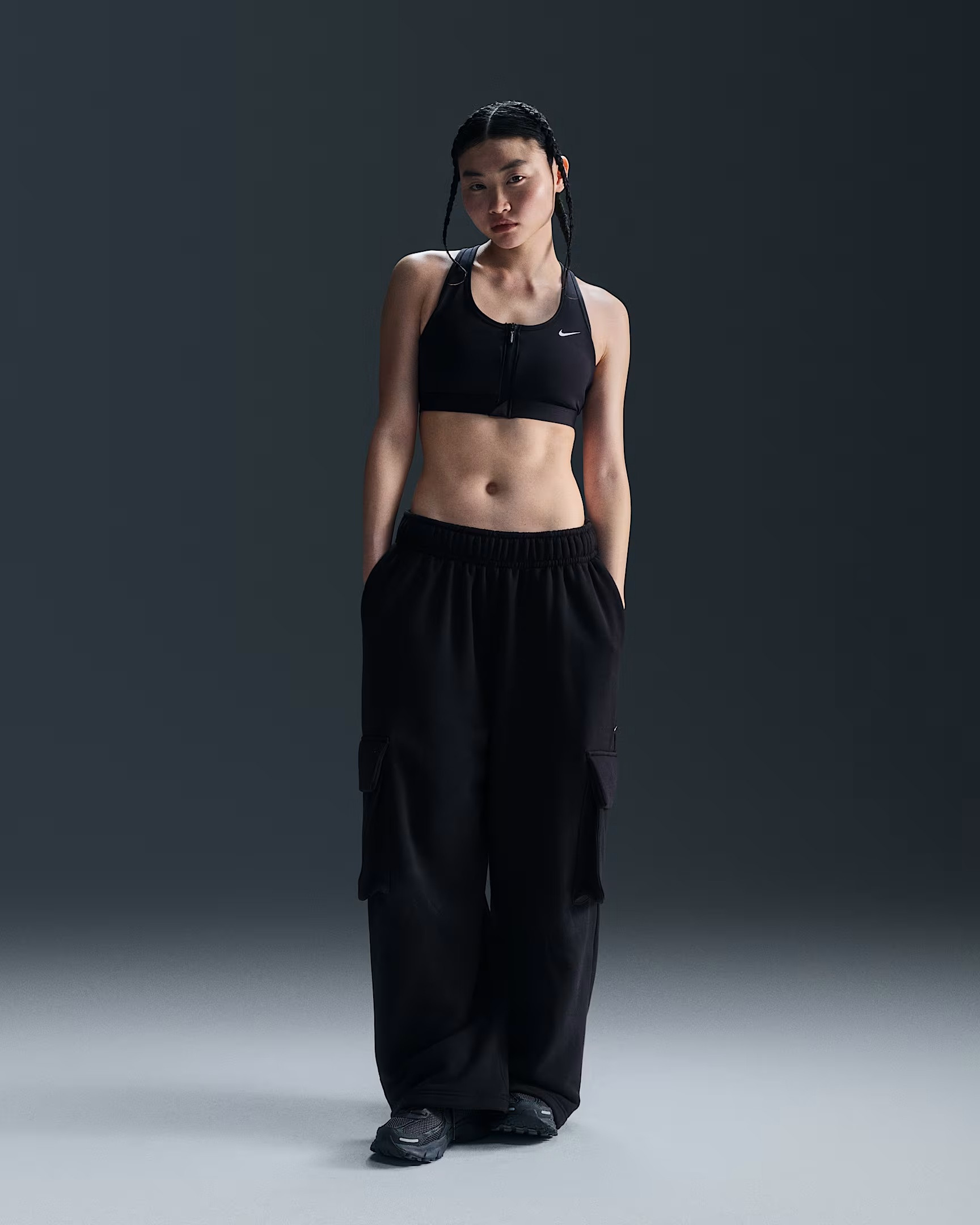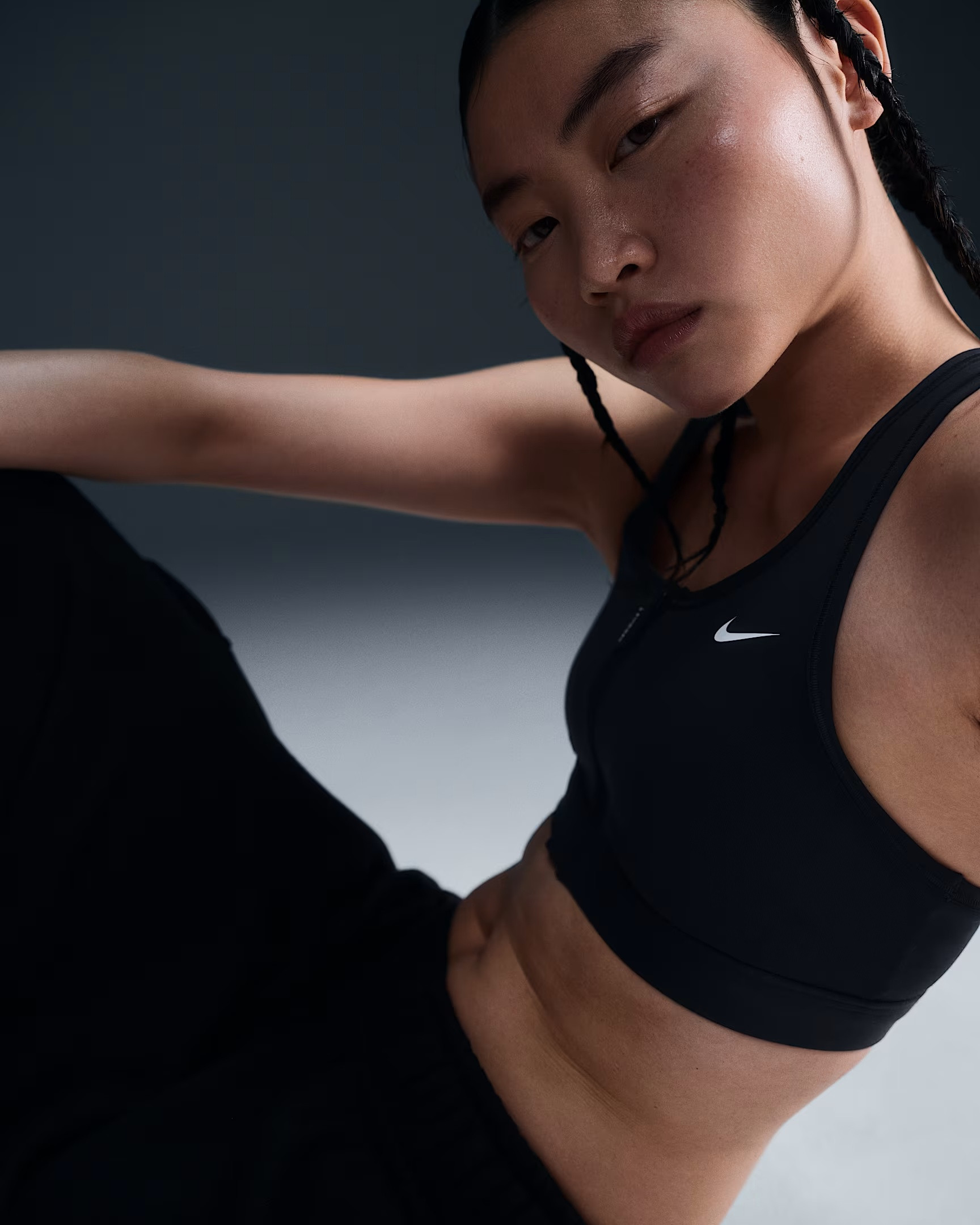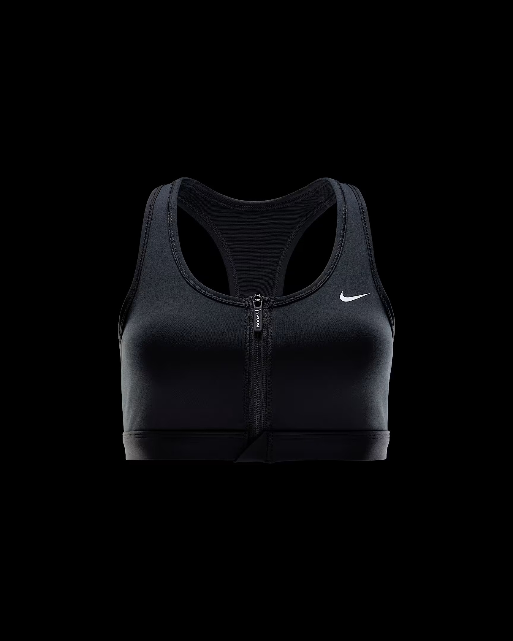 Putting on and taking off your sports bra shouldn't be the hardest part of your workout. The front zipper of this Swoosh bra makes it easy to put on and take off, and the semi-automatic zipper provides plenty of security. The close-fitting, medium support is ideal for workouts and dance classes, giving you a snug, secure fit. The sewn-in padding stays put, so you don't have to worry about it slipping or bunching. The sweat-wicking, adaptive fabric quickly regains its shape for comfortable wear throughout your workout.