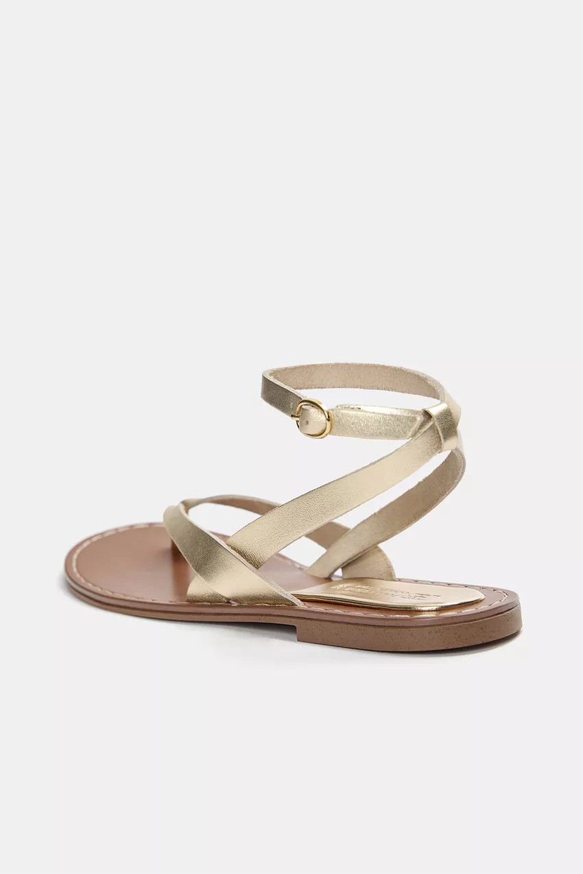 Flat leather sandals with a suede finish, available in gold. Buckle strap closure. Sole height: 1 cm.