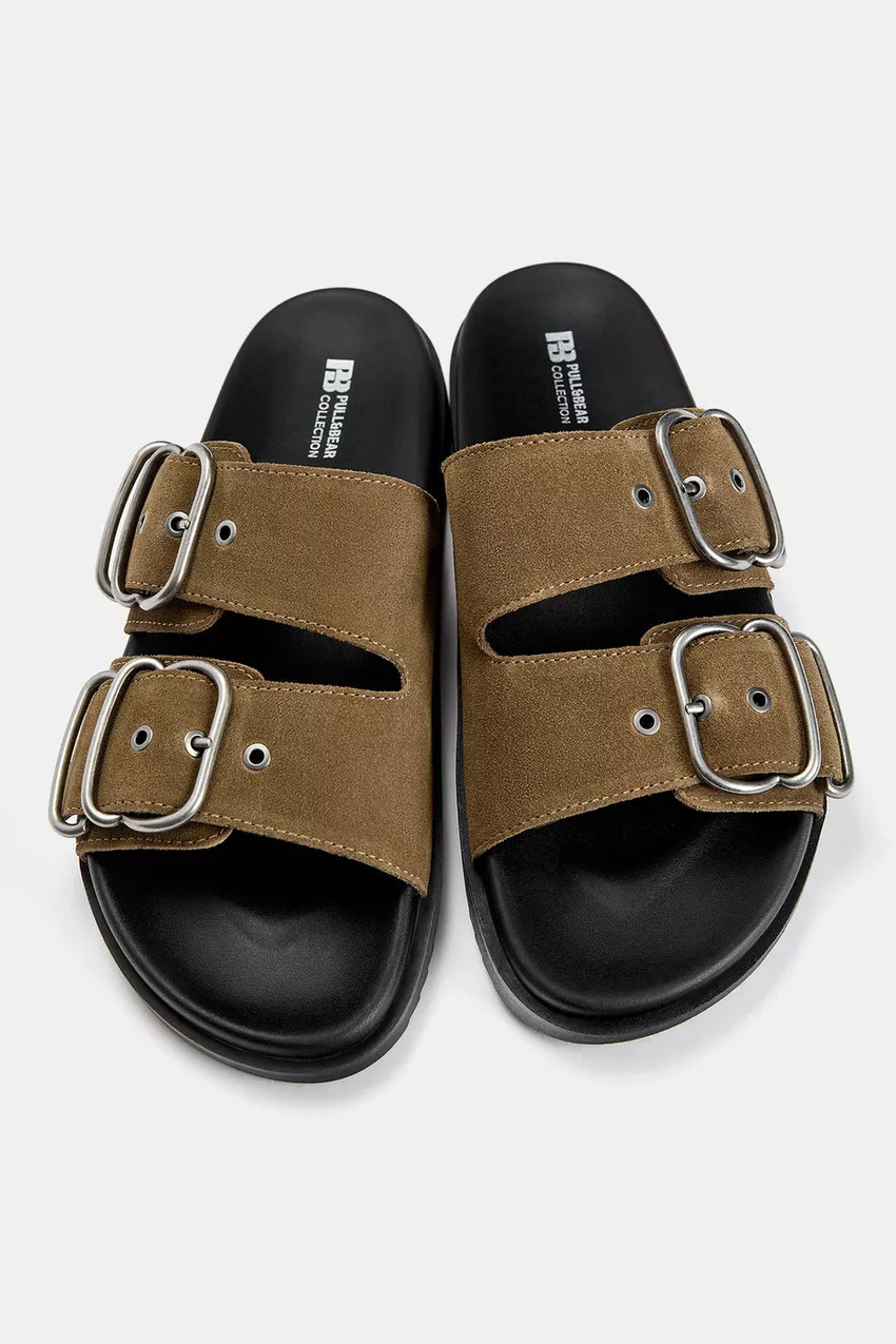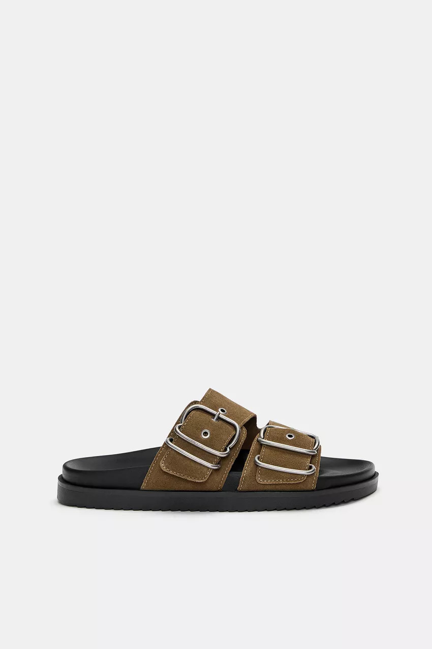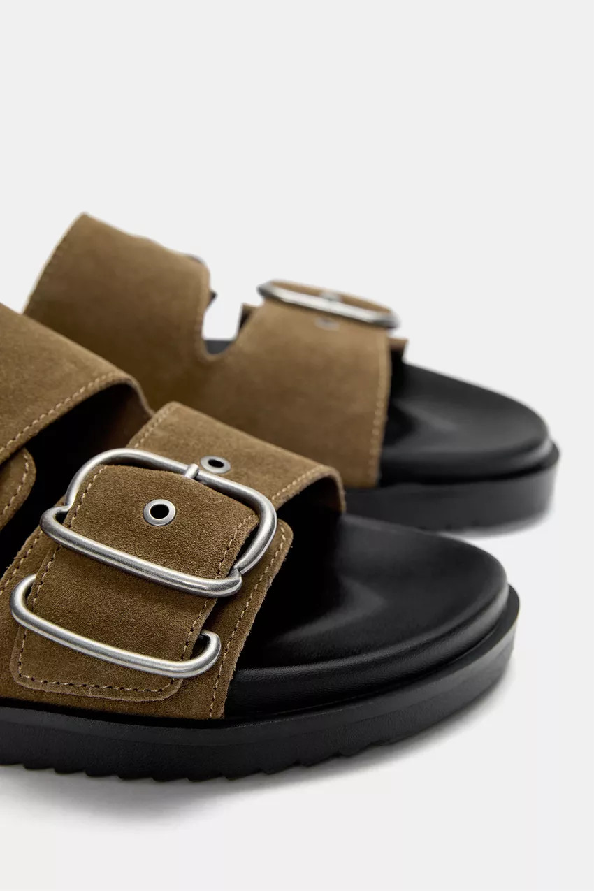 Flat leather sandals with a suede finish, available in brown. Buckle detail on the straps.