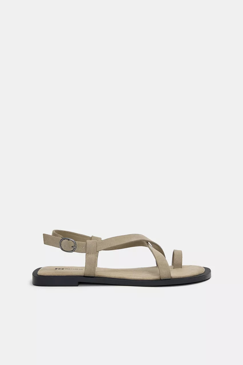 Flat leather sandals with a suede look, available in brown. Wide strap detail on the cut. Closure with a back buckle. Sole height: 2 cm.