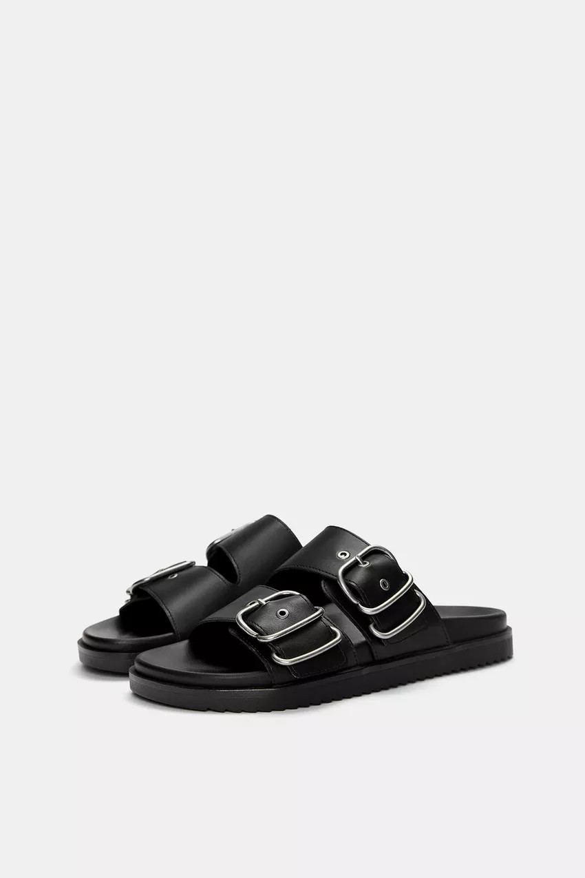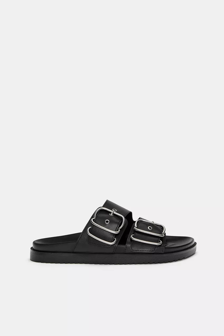Flat sandals available in black. Buckle detail on the straps.