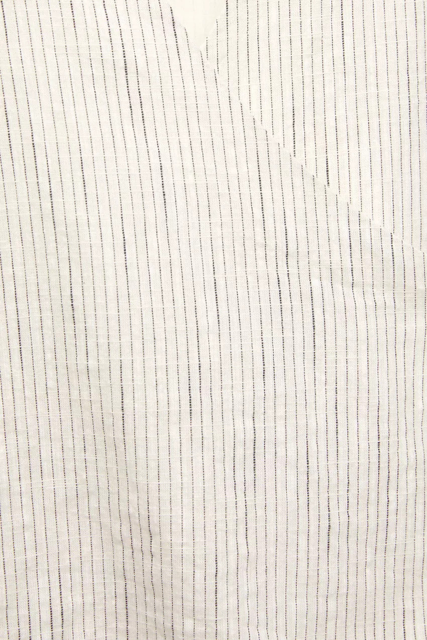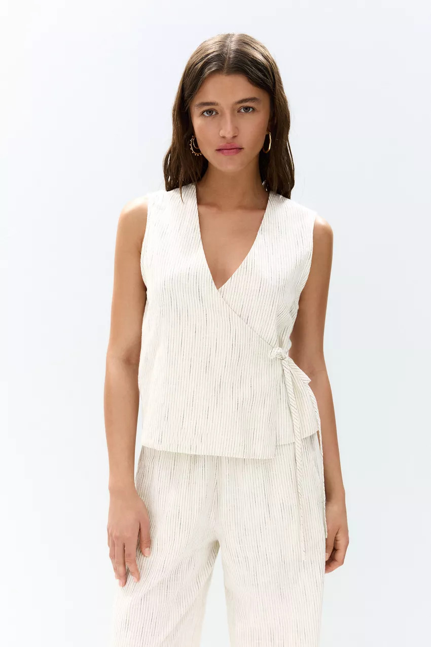 Rustic top with a wrap neckline, striped design, and tie closure, made from 100% cotton fabric.