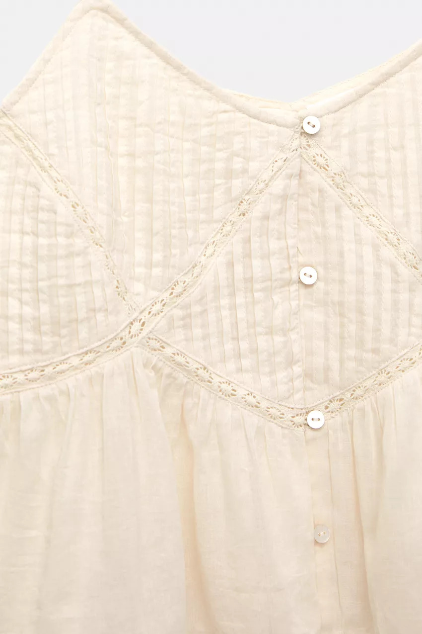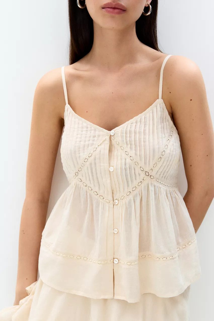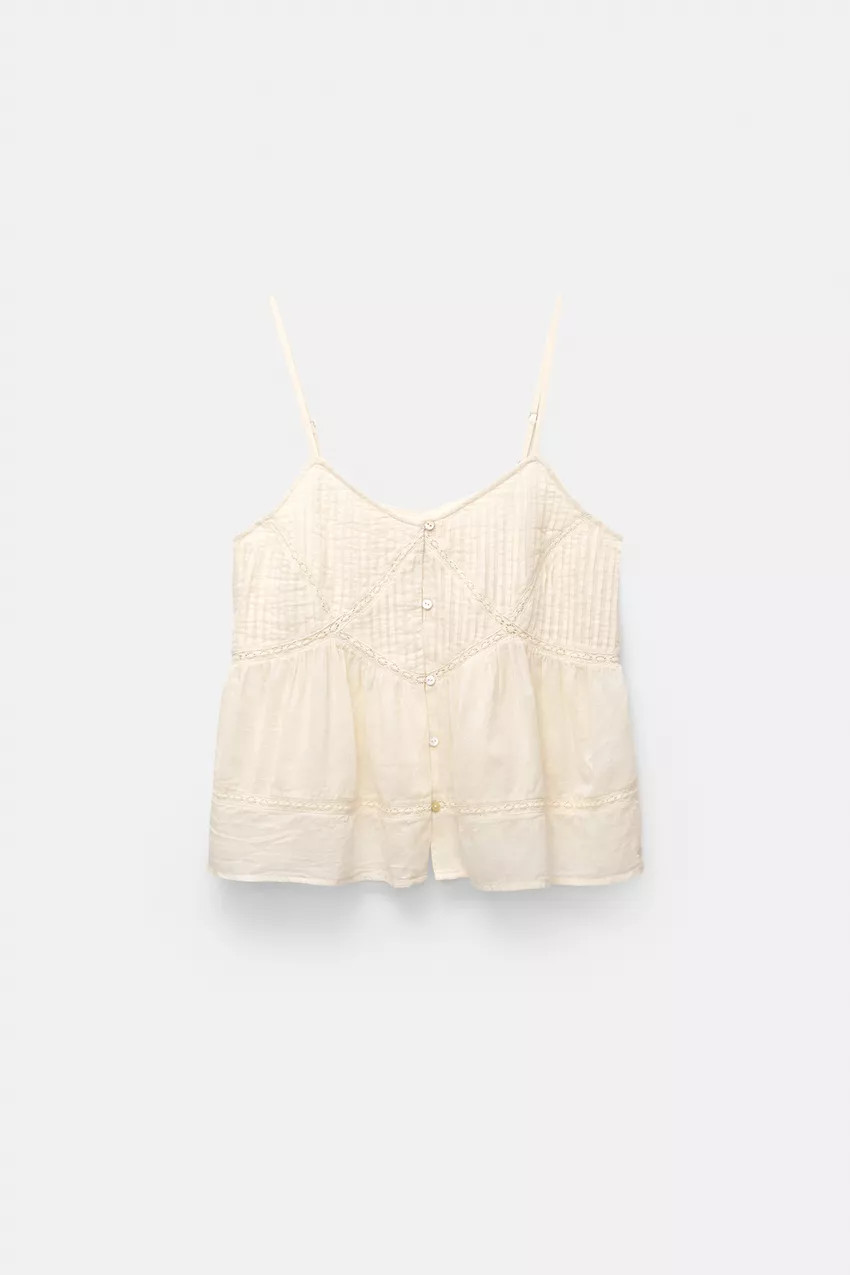 Tank top with narrow straps, lace trim, and button closure.