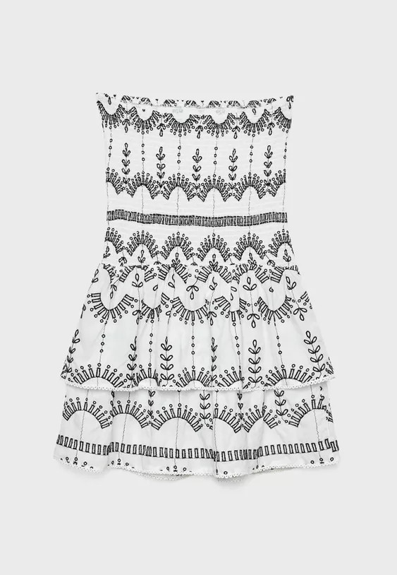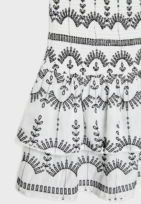 Short off-the-shoulder dress with stretch top, flowing hem, square neckline, fabric detail with contrasting embroidery and hem with lace edge