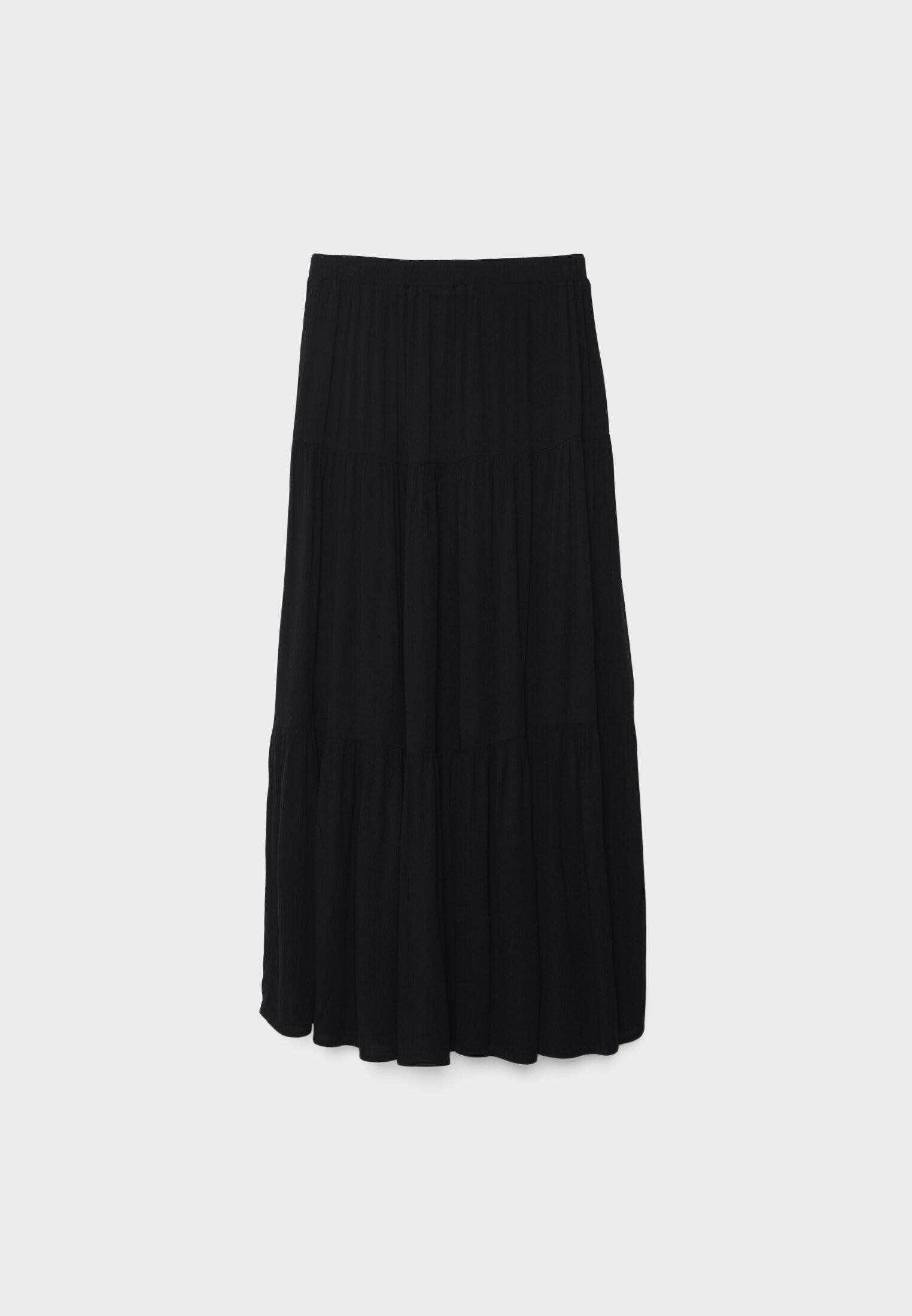 Flowing midi skirt with an elastic waistband. Tonal lining. Available in various colors.