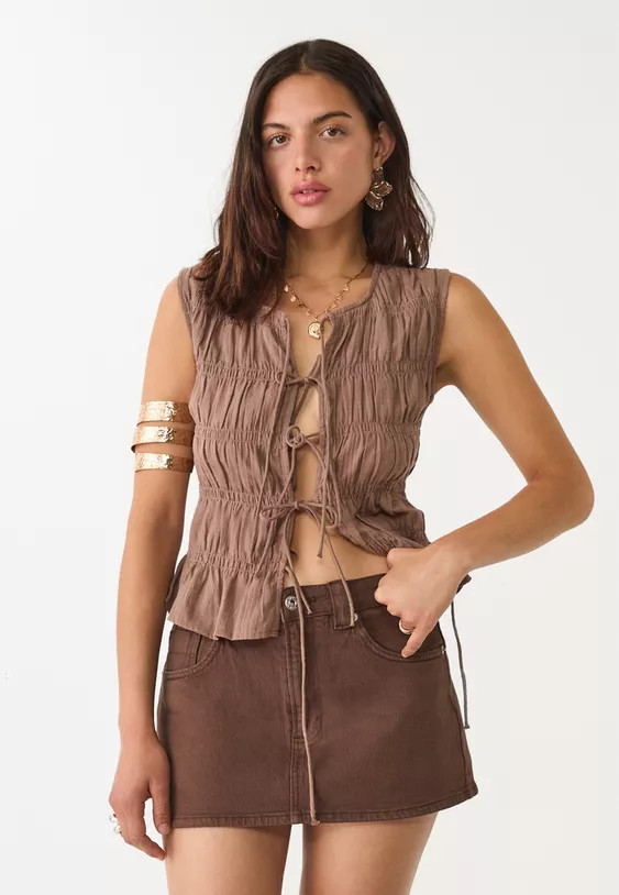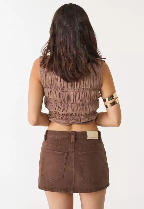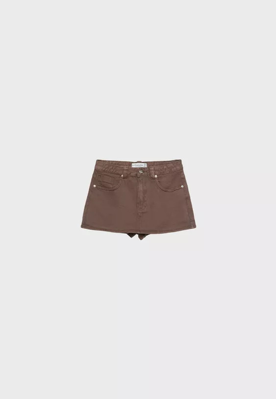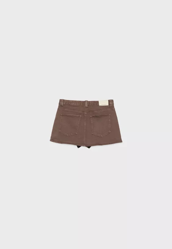 Denim mini skirt with a mid-rise waist, loop waistband, front pockets, patch pockets at the back, and a front zip closure with a metal button.