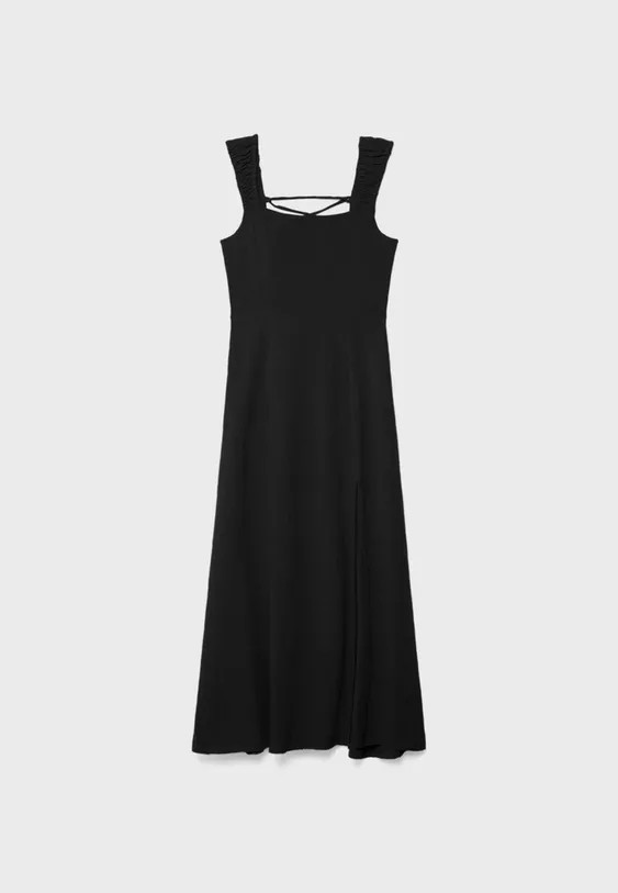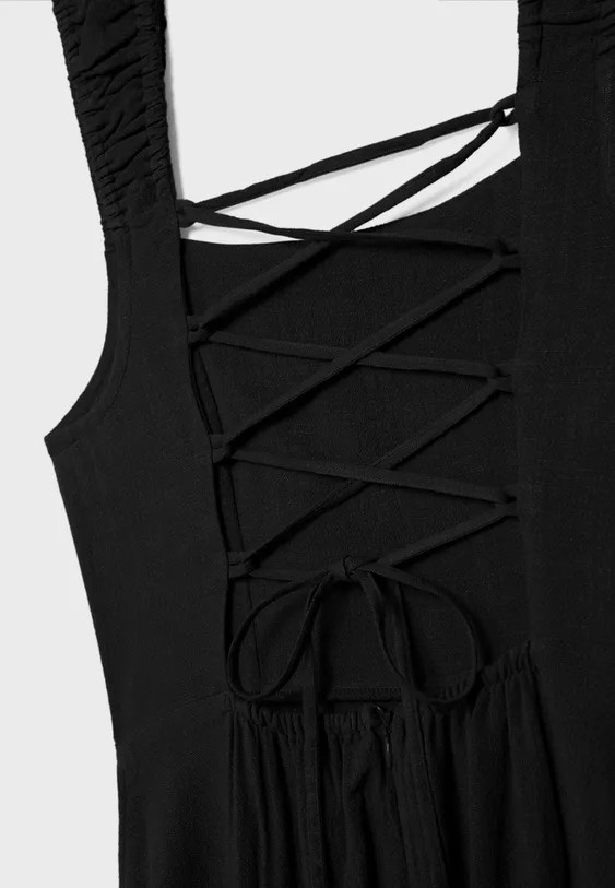 Flowing midi dress made of viscose fabric with linen, featuring a square neckline, gathered stretch straps, an open back with adjustable wrap-style straps, lacing, and a concealed zip closure at the back.