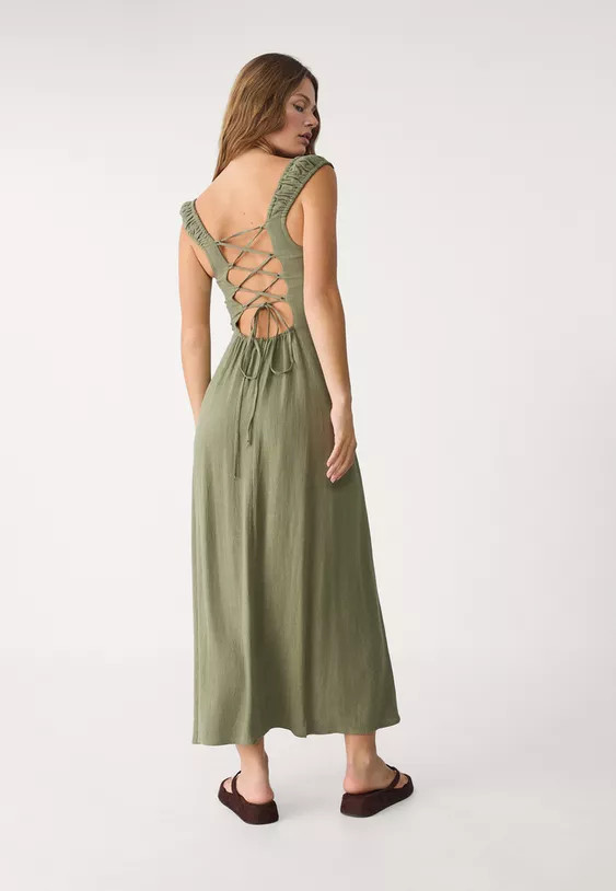Flowing midi dress made of viscose fabric with linen, featuring a square neckline, gathered stretch straps, an open back with adjustable wrap-style straps, lacing, and a concealed zip closure at the back.