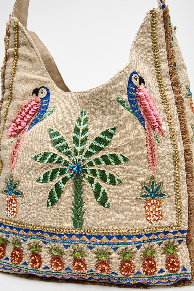 Shopper bag with a beaded design top. Shoulder strap. Inside zip pocket.
