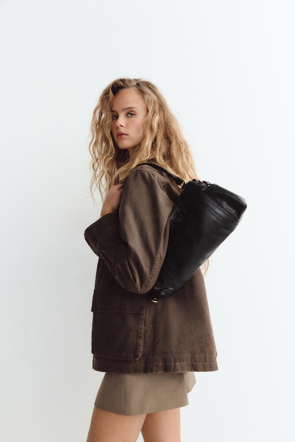 Shoulder bag with side pockets. Gathered detail. Double shoulder strap with contrasting metal detail. Double inside pocket with zip closure. Magnetic clasp closure.