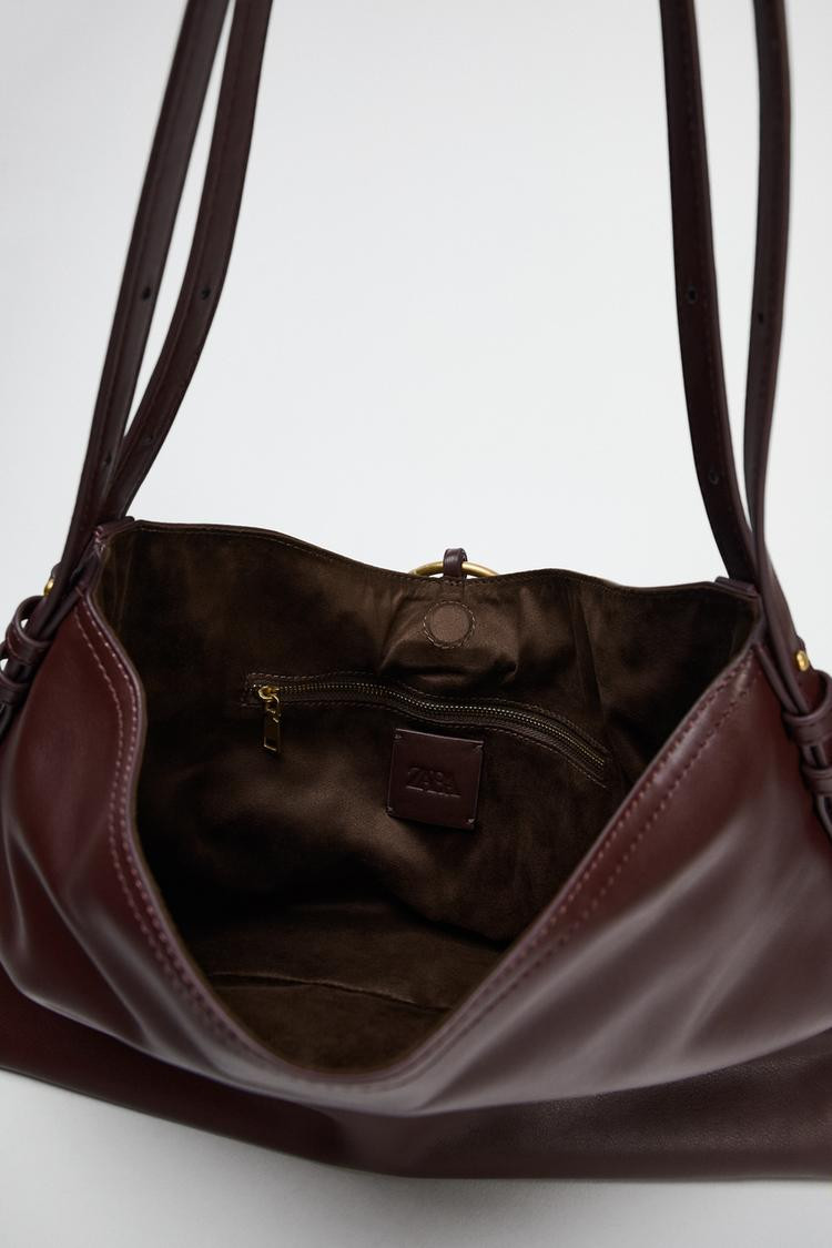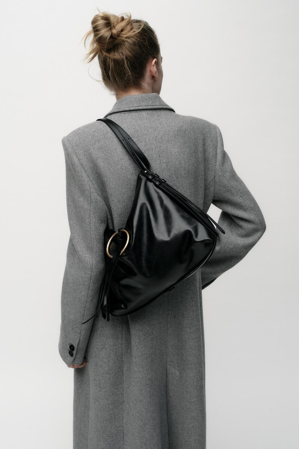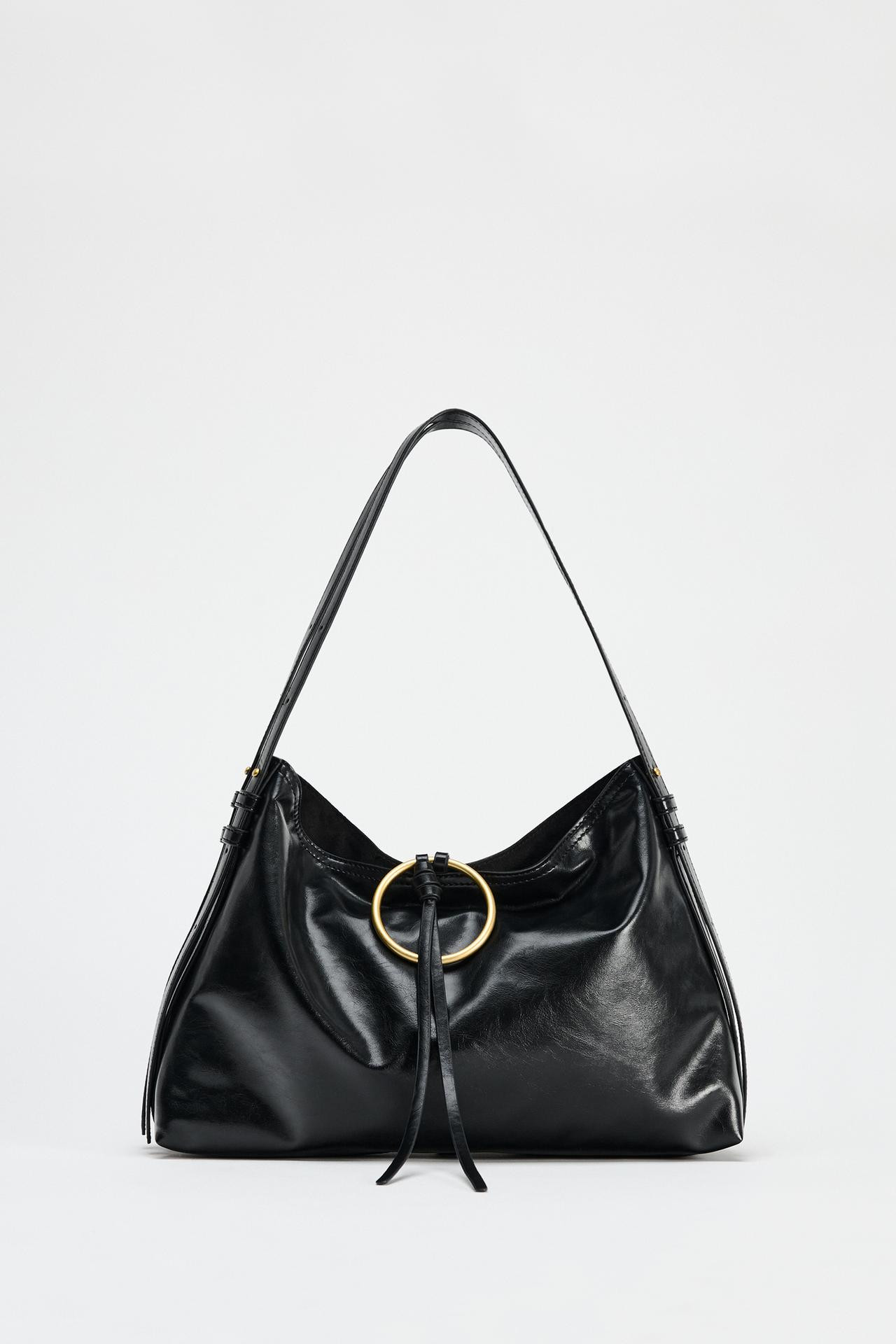 Bucket shoulder bag. Circular metal detail on the front. Double adjustable shoulder strap. Interior zip pocket. Magnetic clasp closure.