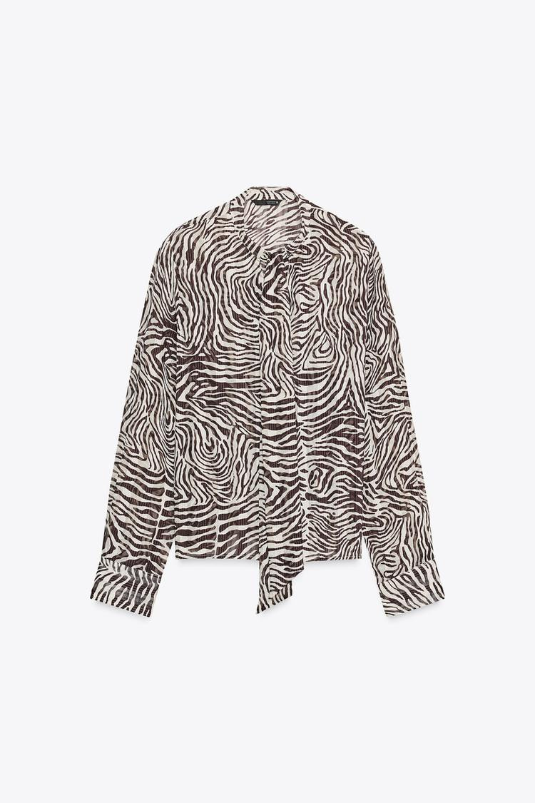Round neck blouse with tied detail and a V-neck. Long sleeves with buttoned cuffs. Button-up front.
