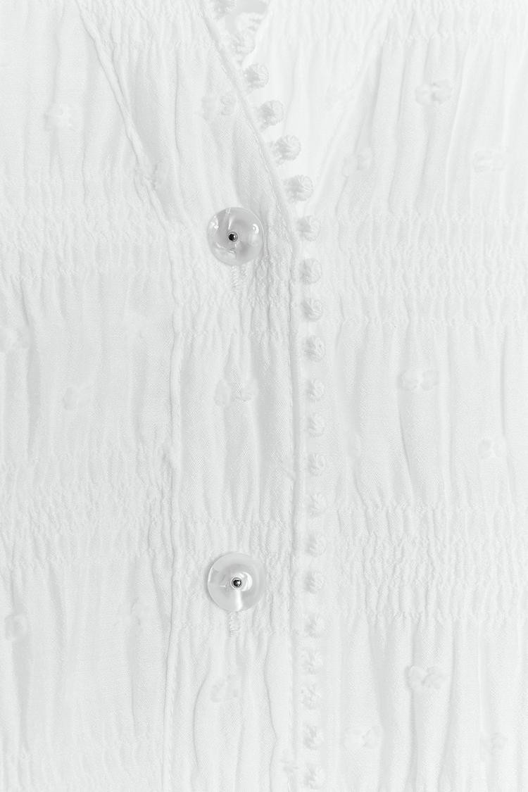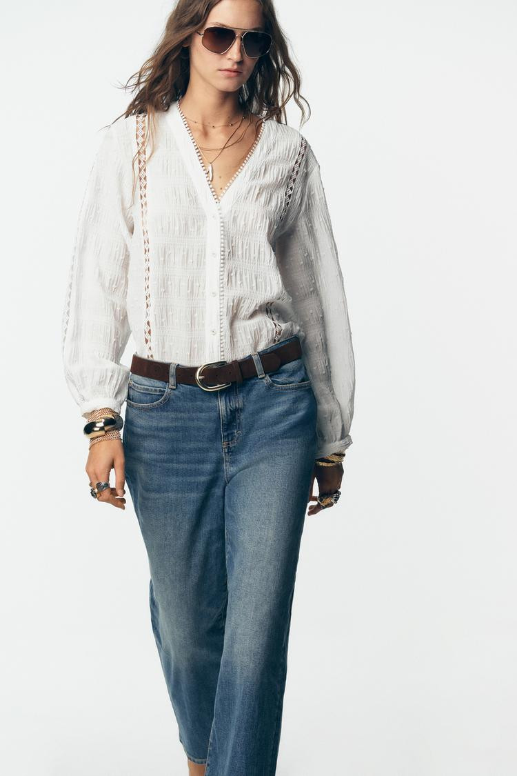V-neck, long sleeve blouse. Featuring gathered fabric, entredeux lace trim and dotted mesh detailing. Button-up front.