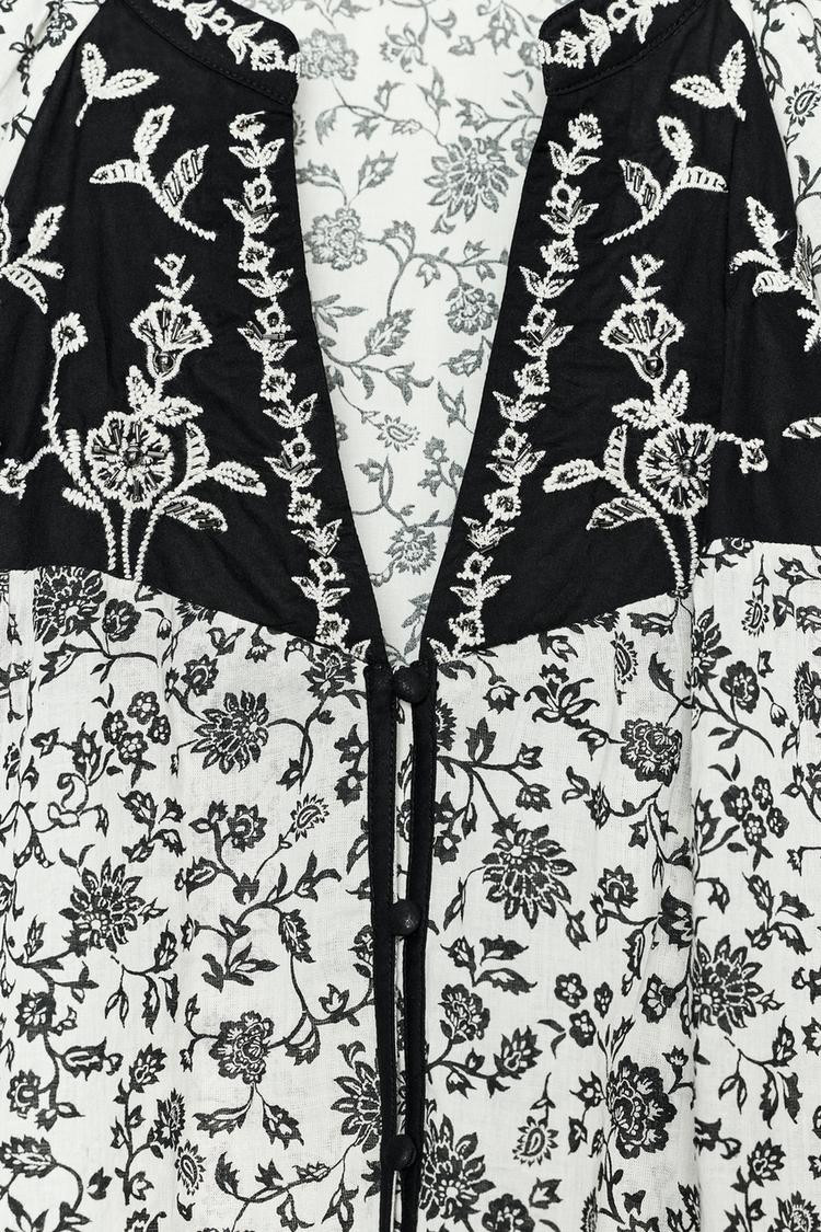 Round neck blouse with a V-neck and long sleeves. Featuring embroidery and bead detail. Button-up front.