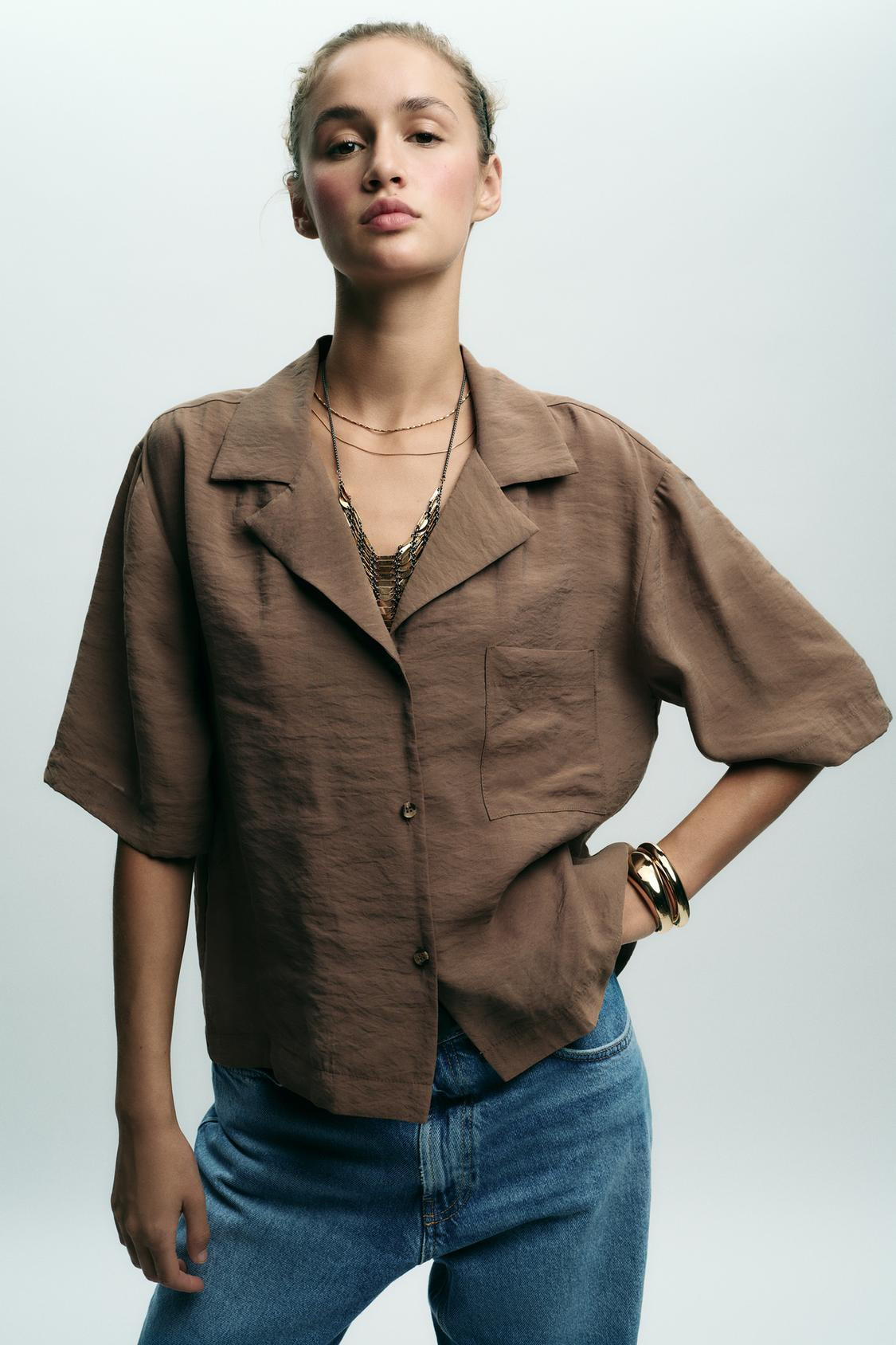 Collared short sleeve blouse. Featuring a front patch pocket and button fastening.