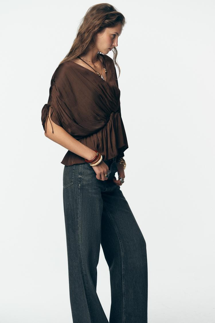 Blouse with a crossover V-neck and thin straps with bead detail. Short sleeves with gathered details and drawstrings. Elasticated waist.