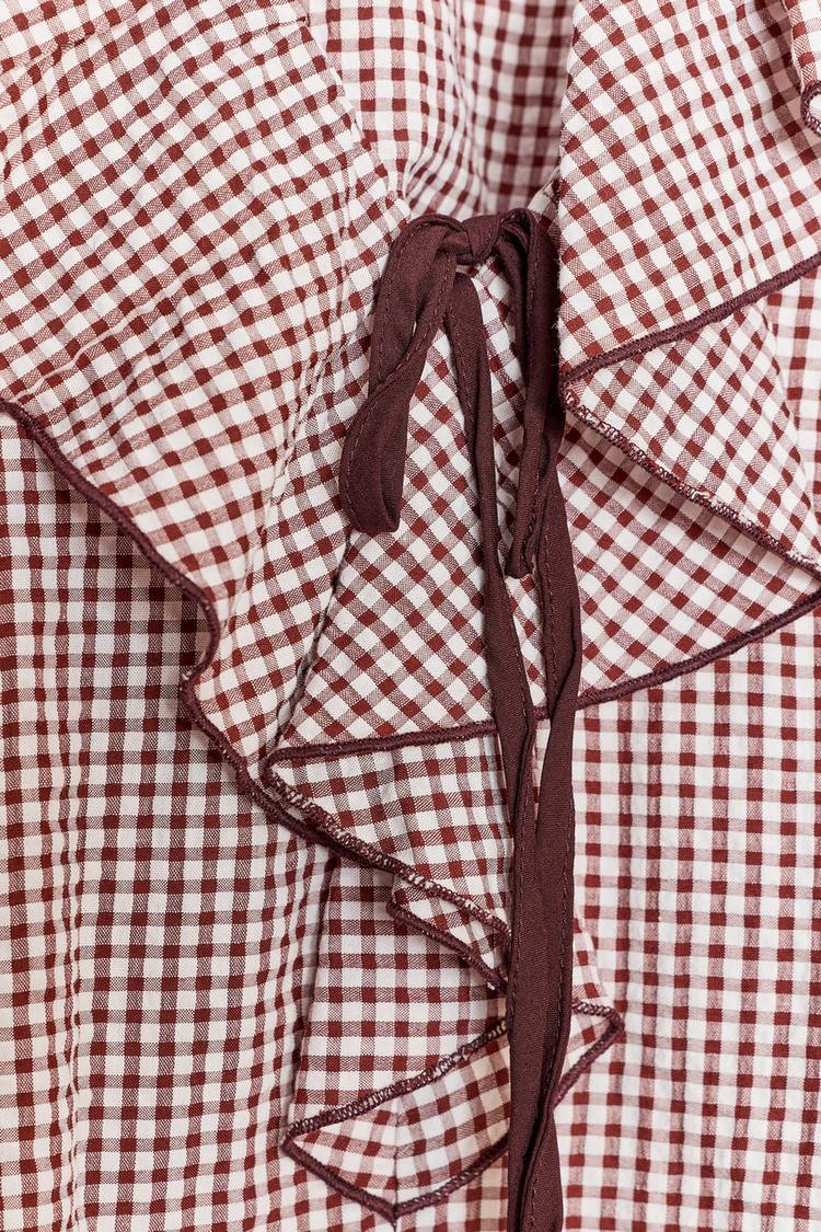V-neck blouse with ruffle and bow detail. Long sleeves.