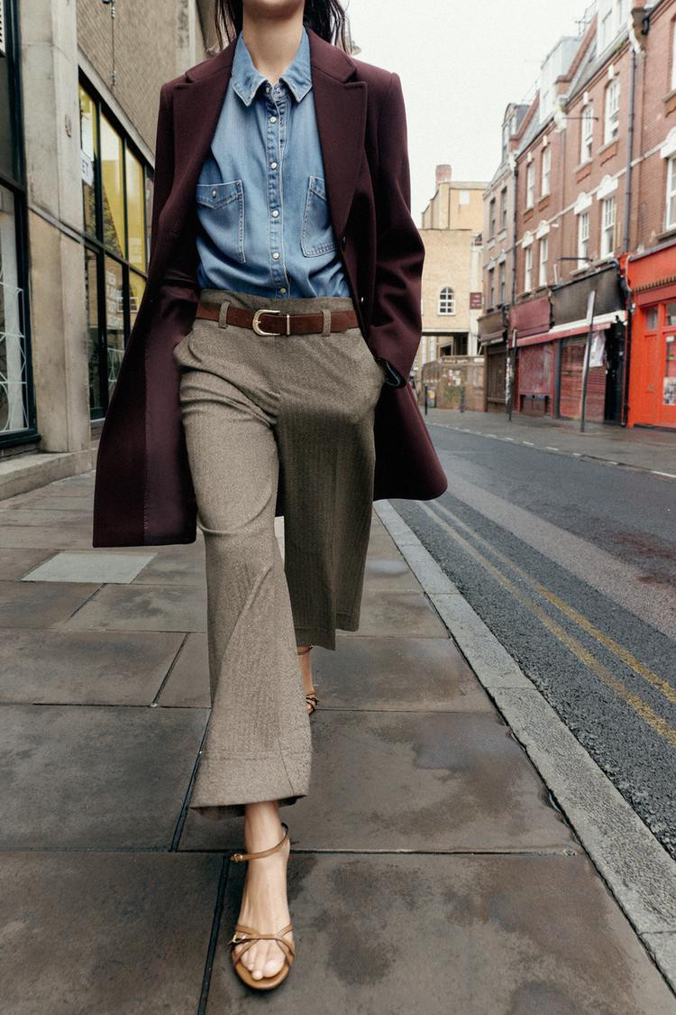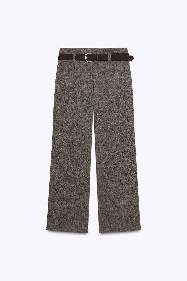 High-waist trousers with belt. Featuring front pockets and false welt pockets at the back. Straight leg. Front fastening with zip, inside button and hook.