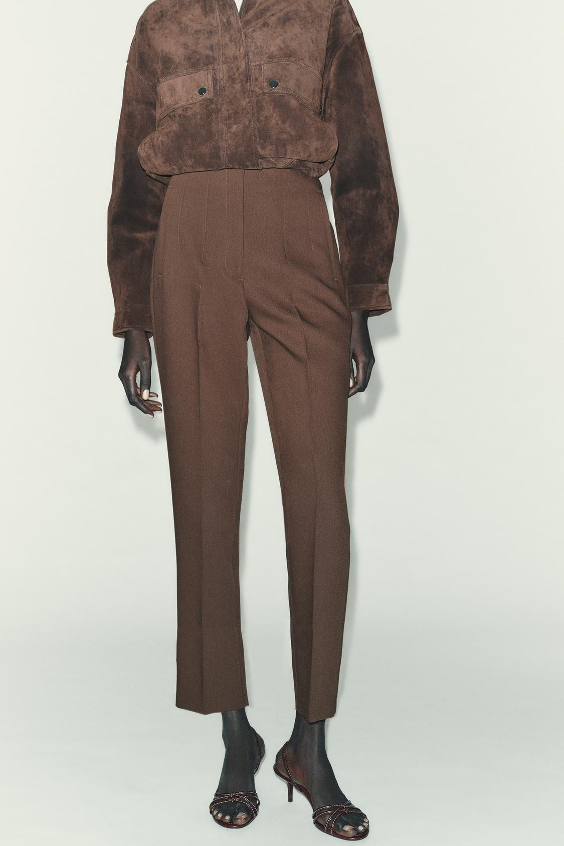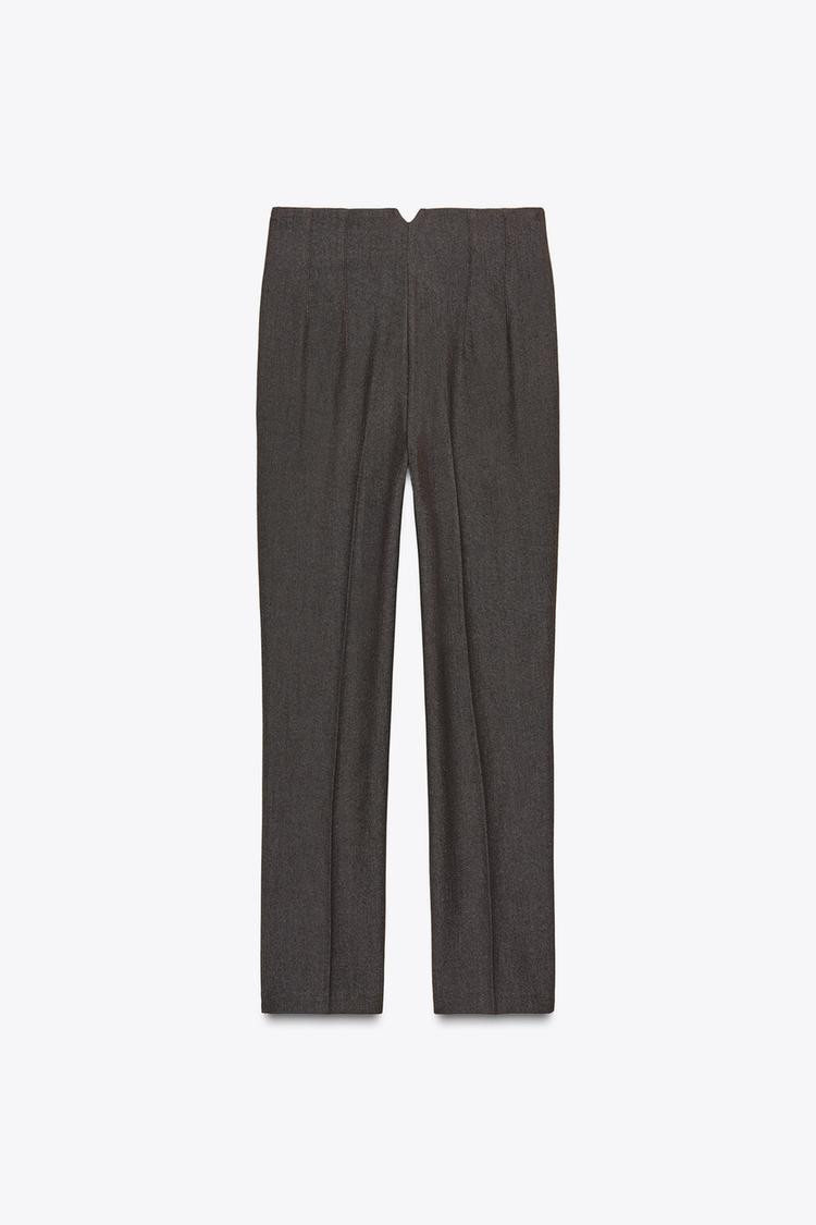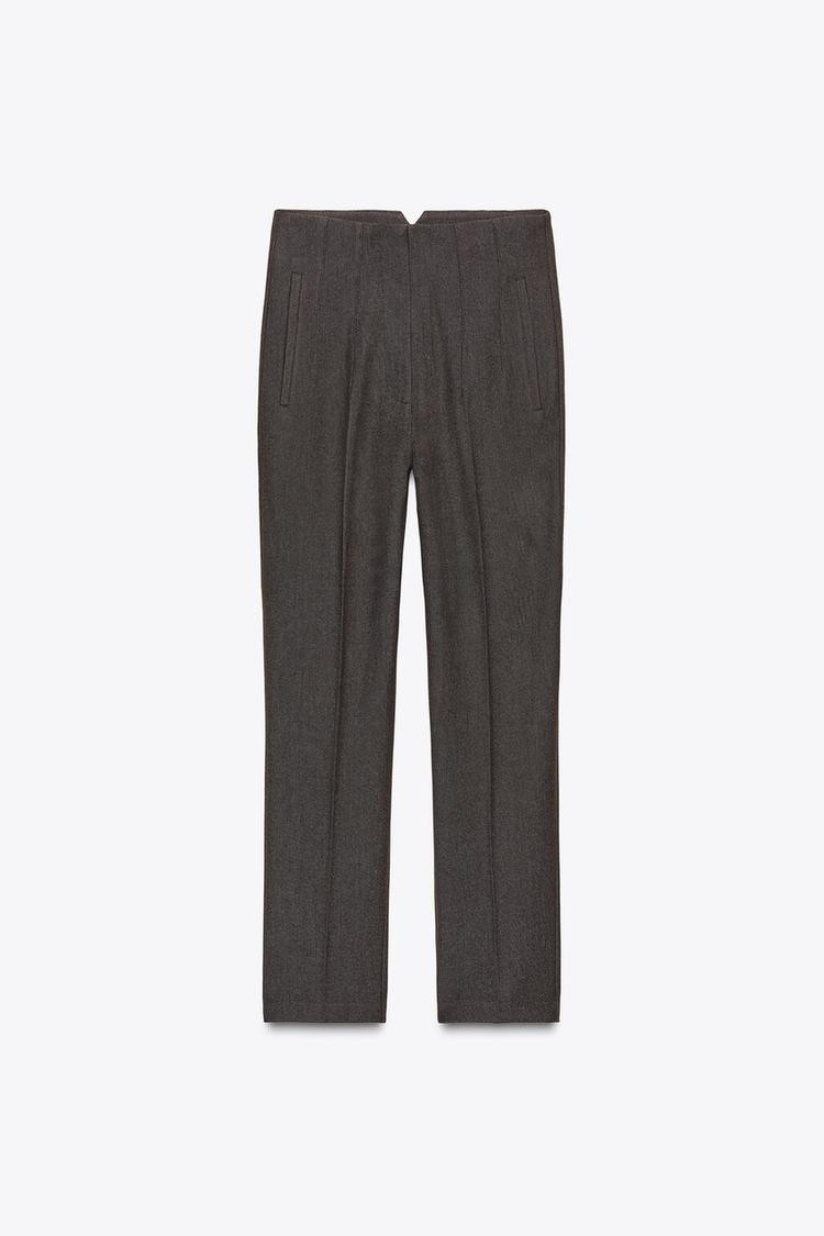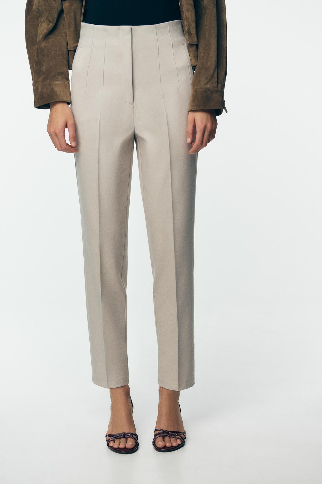 High-waist trousers with seam detail on the front and back. Front welt pockets. Front zip fly, inside button and metal hook fastening.