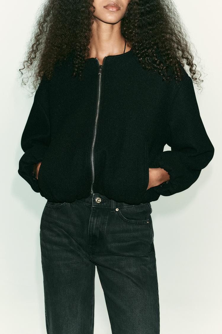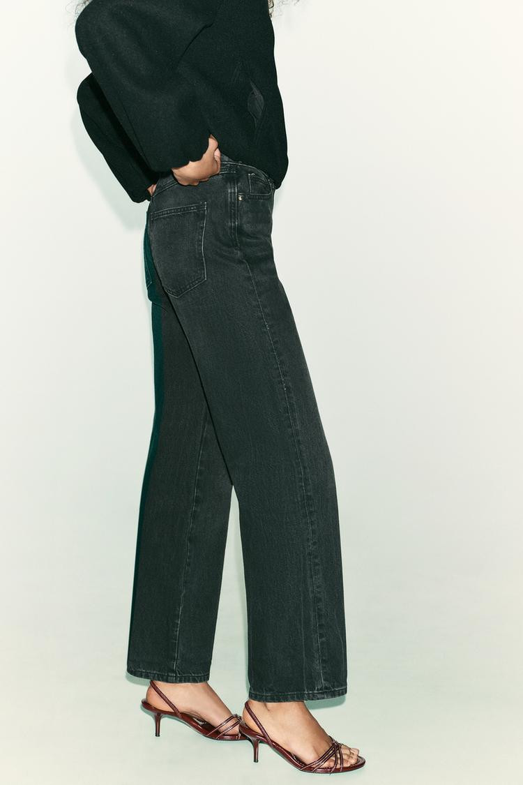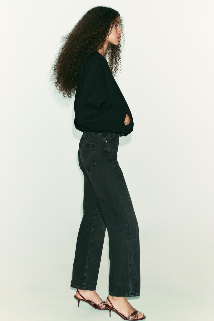 High-waist jeans with five pockets. Straight, long leg. Front zip and button fastening.