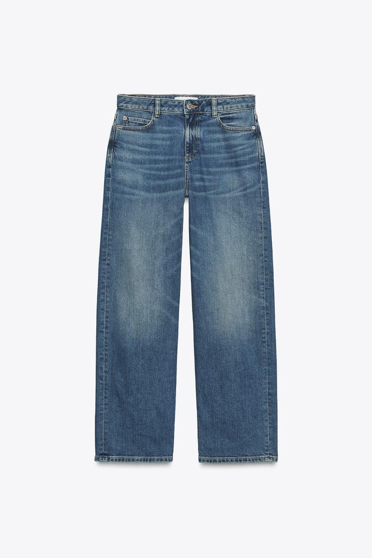 Mid-waist jeans with five pockets. Straight, loose leg. Front zip and button fastening.
