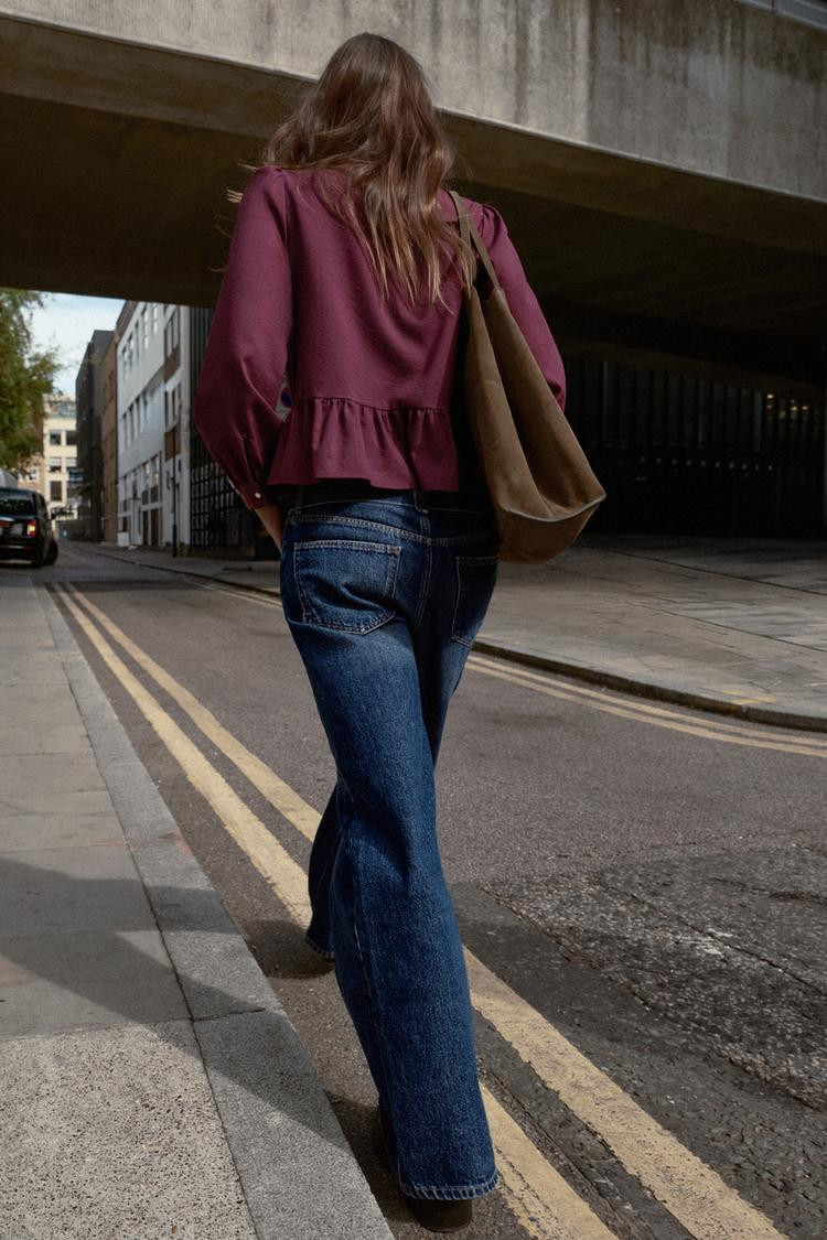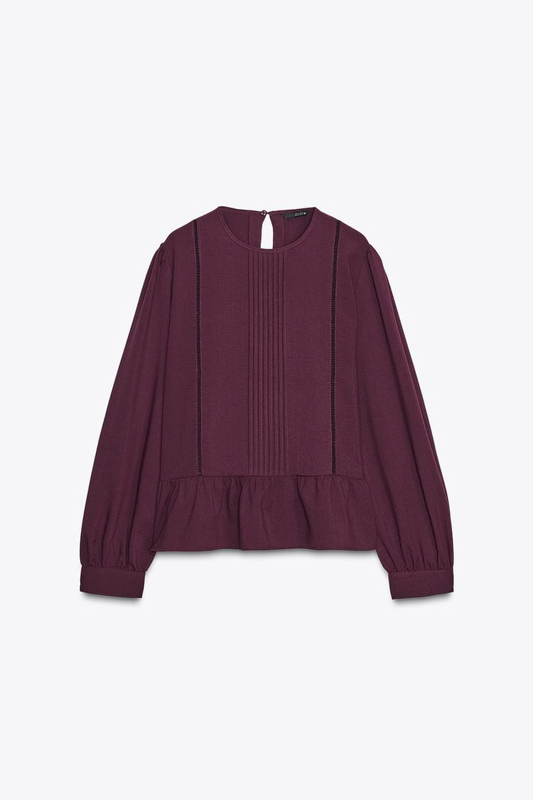 Round neck blouse with long puff sleeves and buttoned cuffs. Tonal ladder stitch detail. Peplum hem. Back fastening with keyhole and button.