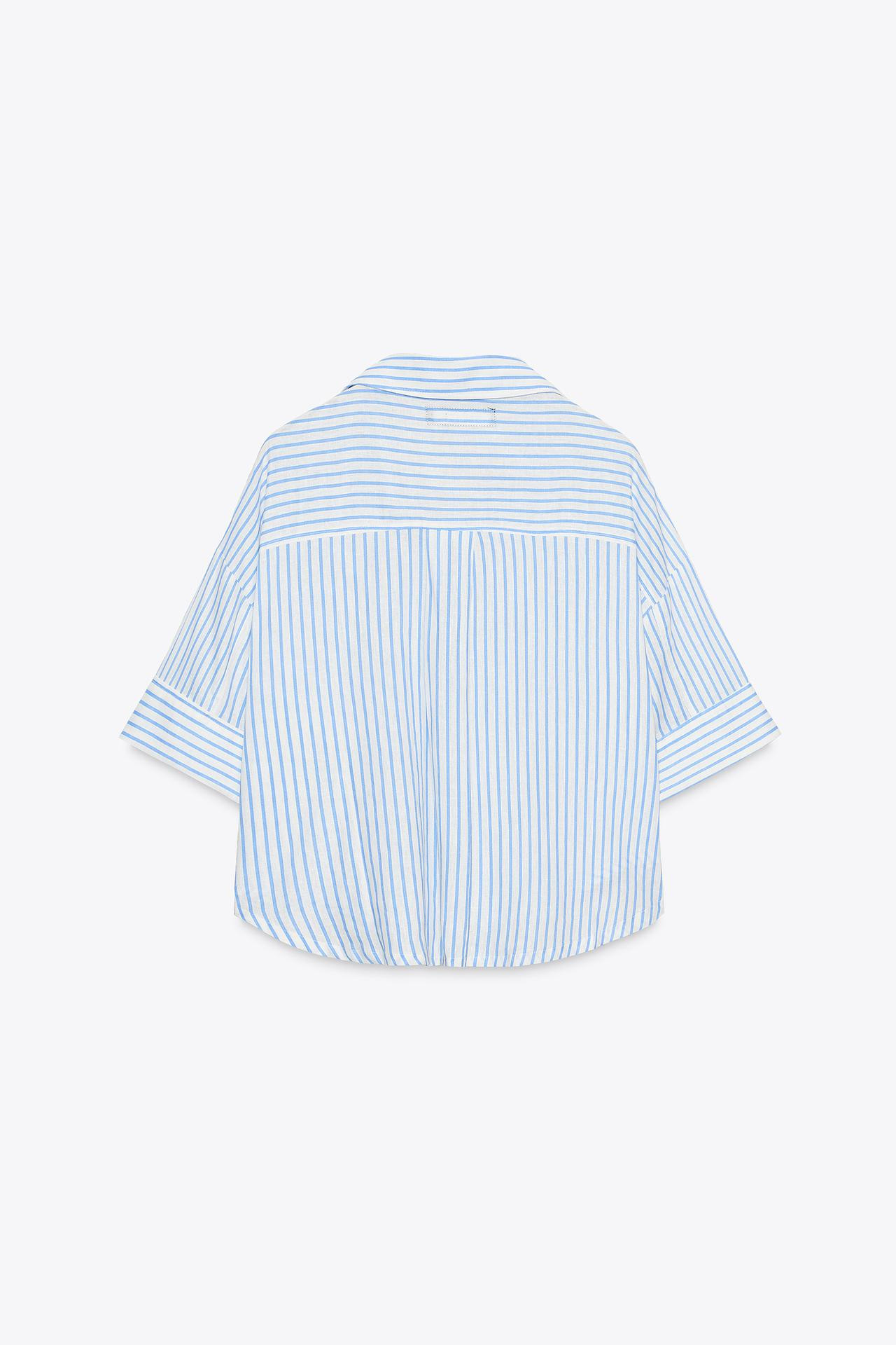 Linen shirt with a lapel collar, V-neckline, and short sleeves. Features patch pockets and a front button placket.
