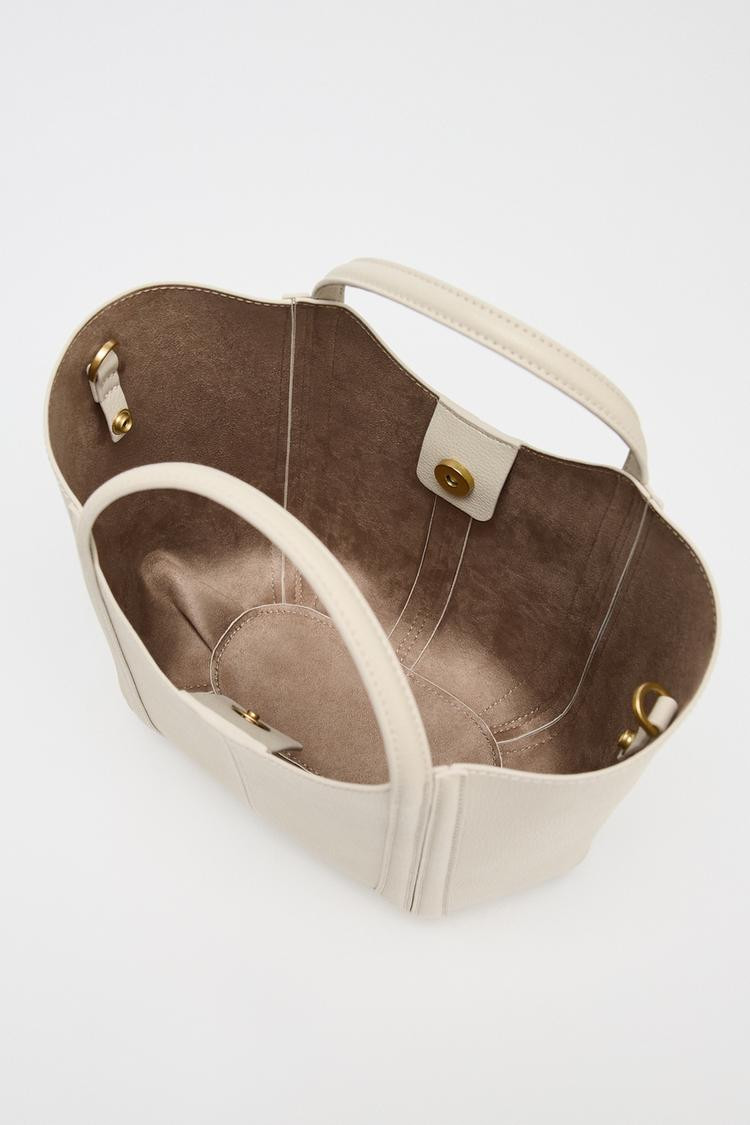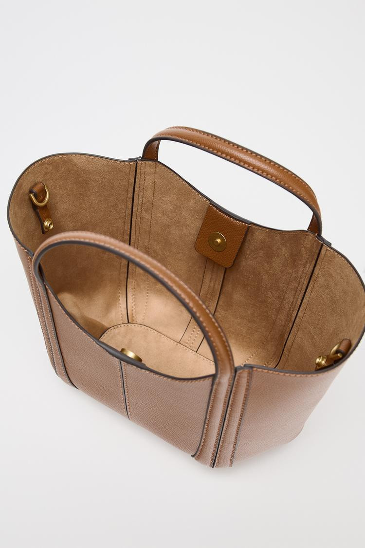Mini city bag with contrast topstitching detail. Top handle and detachable crossbody strap. Detachable inner pouch with zip closure.