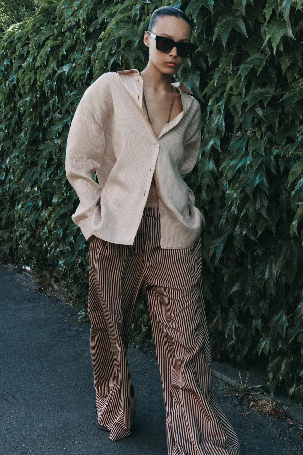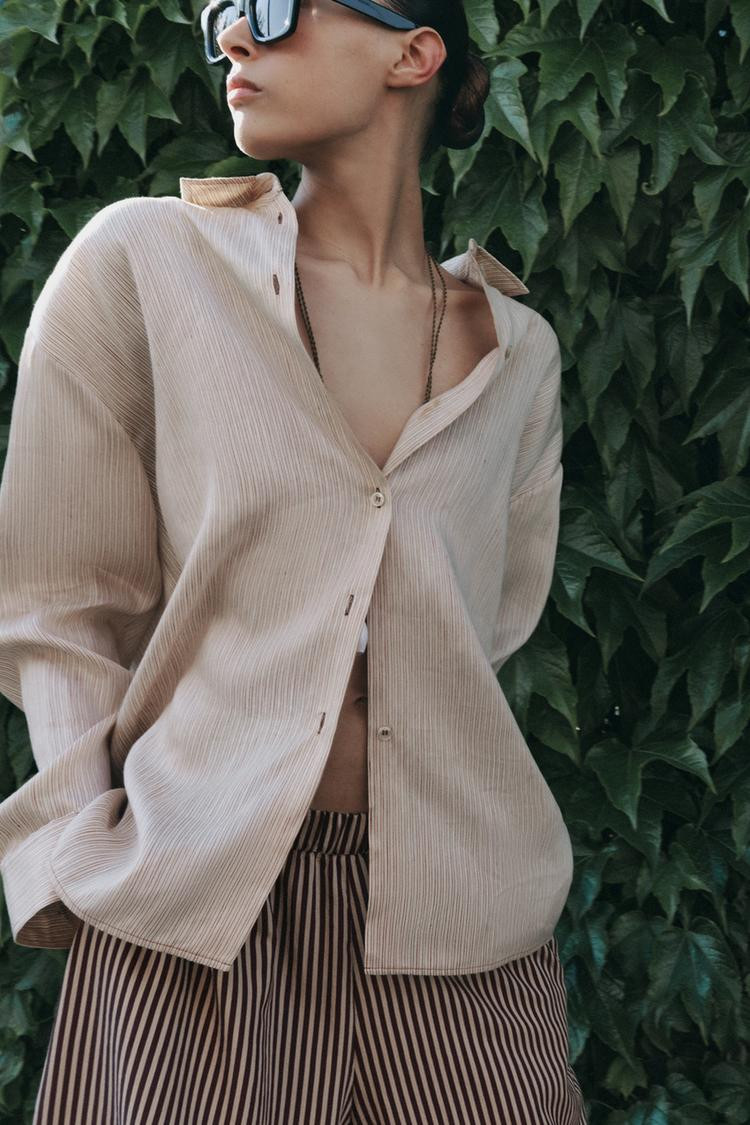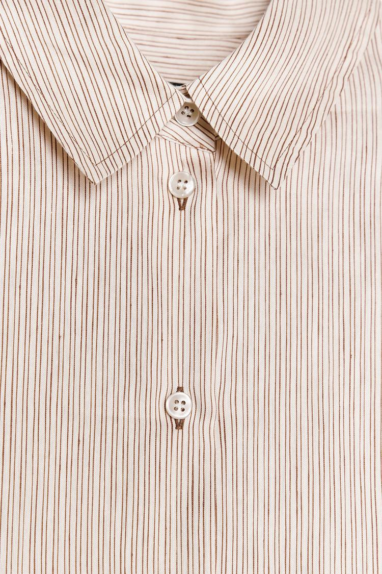 Elegant, loosely draped shirt made from high-quality spun fabric with a refined silk content and 12% linen. Features a notched lapel collar and long sleeves with classic cuffs. The rounded hem and full front button placket complete the design.