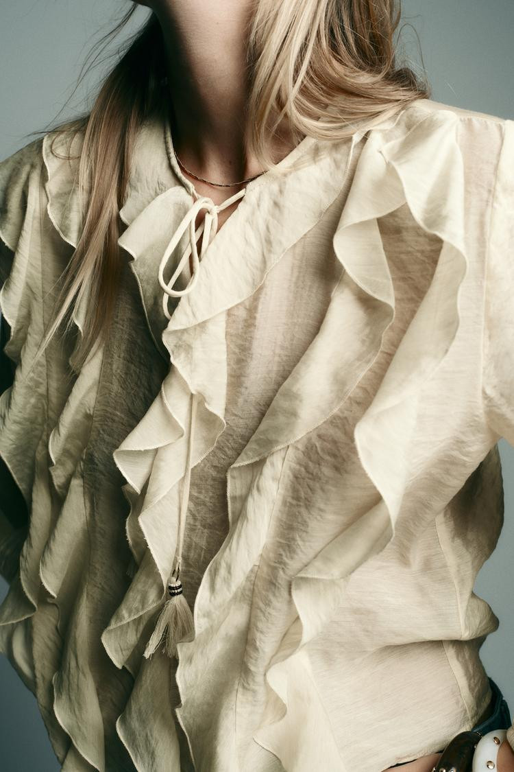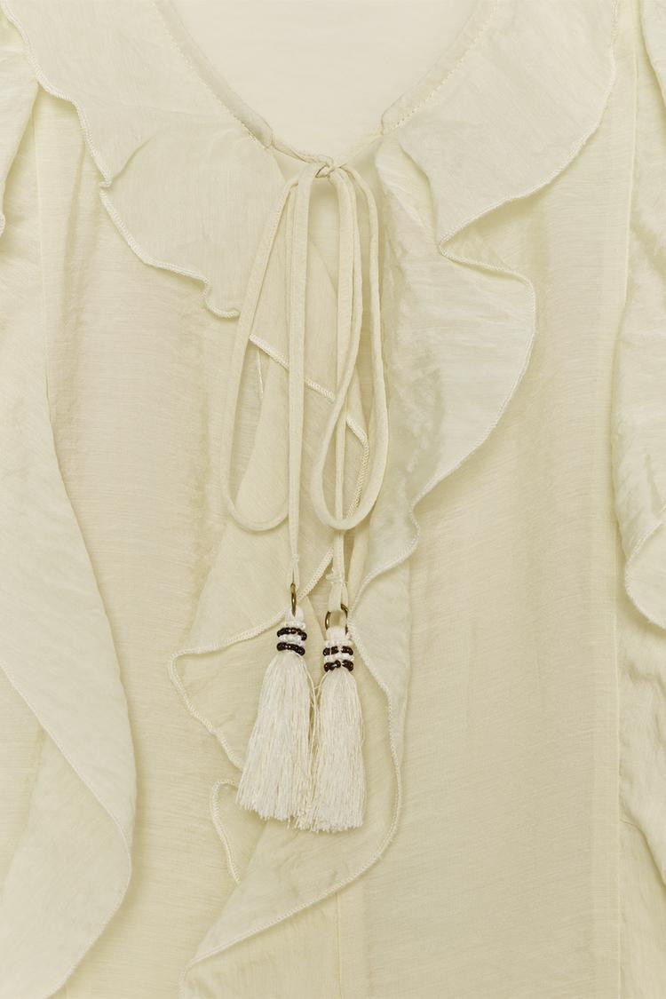 Round neck blouse with tassel drawstring detail. V-neck and long sleeves finished with elasticated cuffs. Ruffle detail.