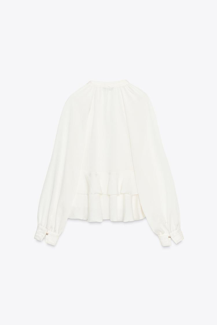 Round neck blouse with a V-neckline and metal buttons. Long sleeves with pleated cuffs. Ruffle trims.
