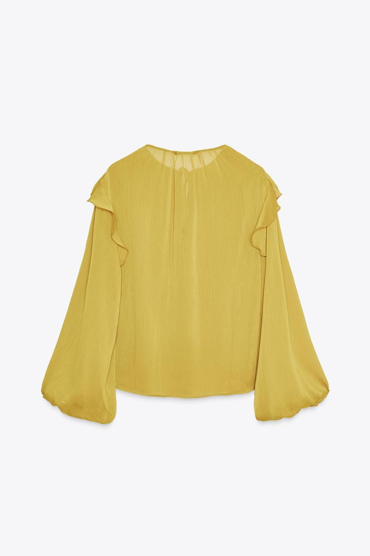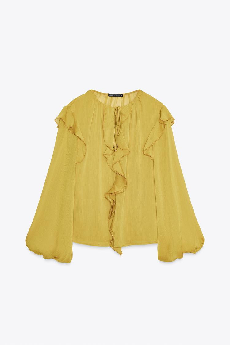 Semi-sheer round neck blouse with a tied V-neck. Long sleeves with elasticated cuffs. Ruffle detail.