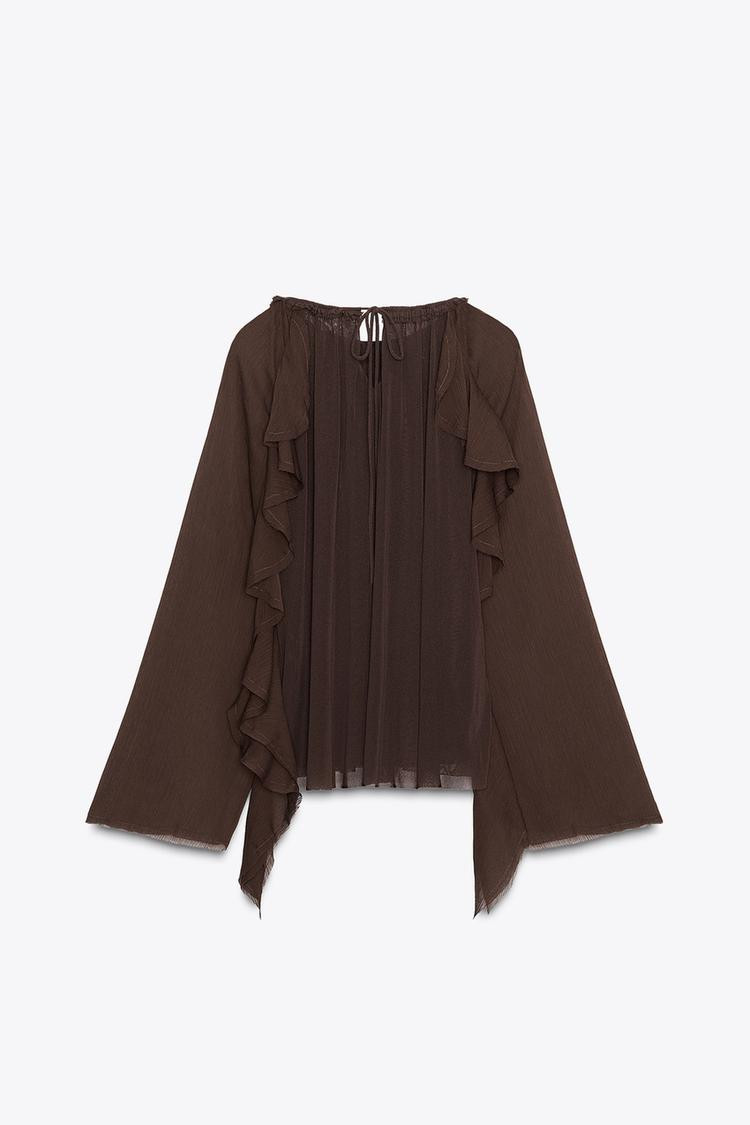 Blouse with a round neck and long sleeves. Ruffle details in the same fabric. Back fastening with an opening and ties.
