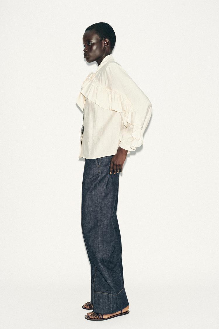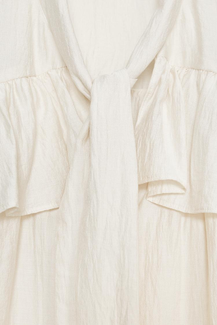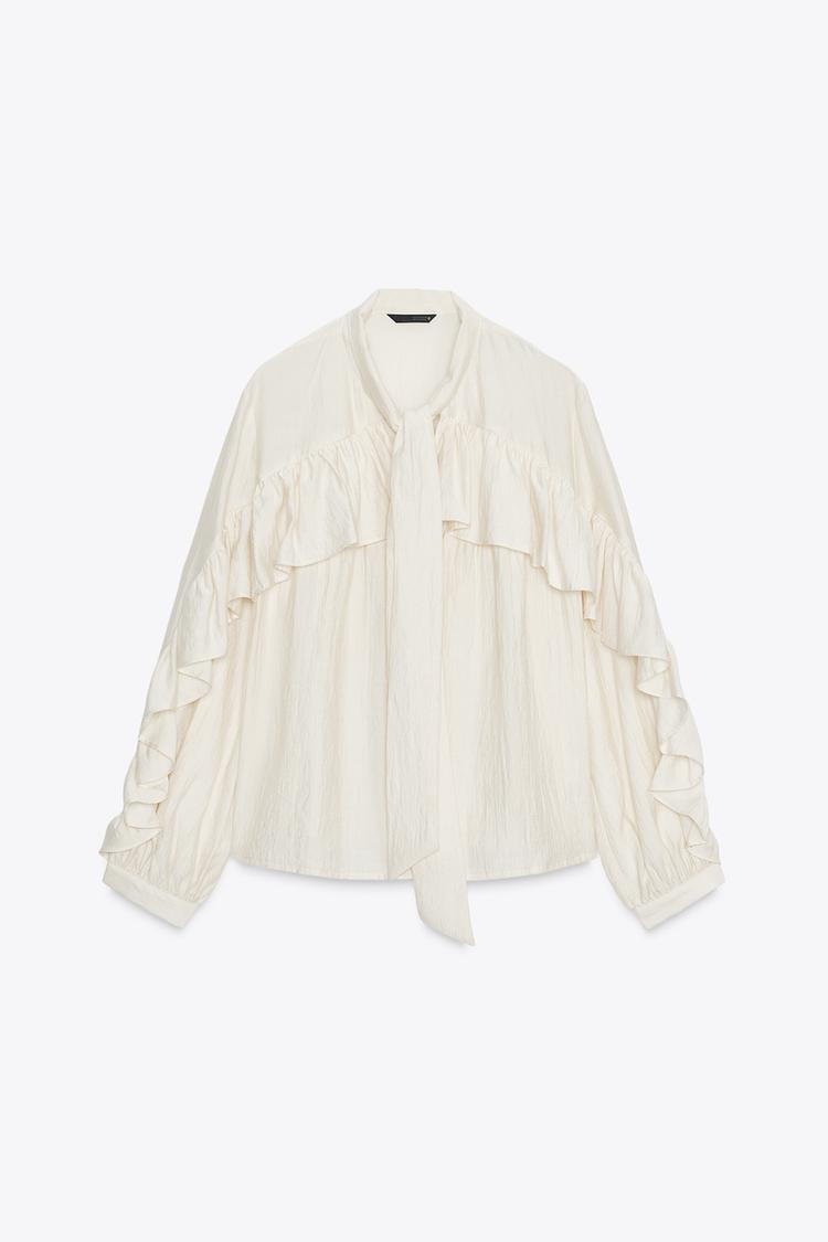 High neck blouse with tied detail. V-neck. Long sleeves with cuffs. Ruffle detail. Front button fastening.