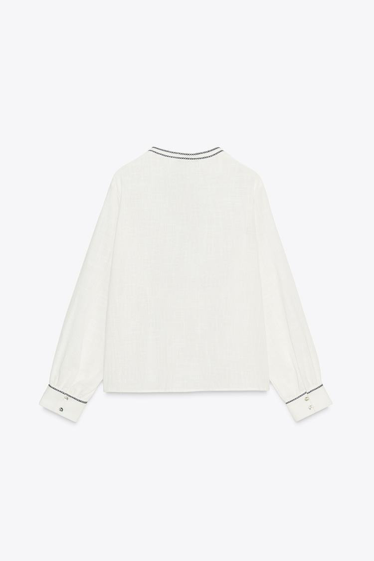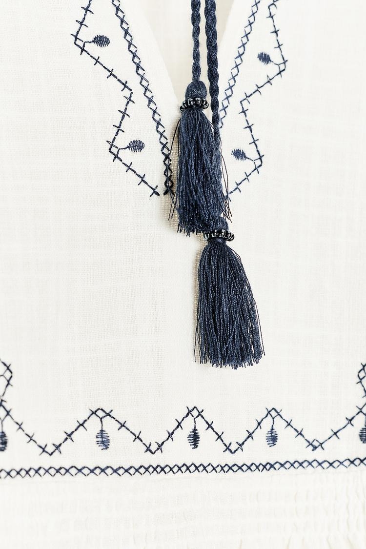 Round neck blouse with a drawstring and tassels. V-neck and long sleeves. Contrasting embroidered detail.