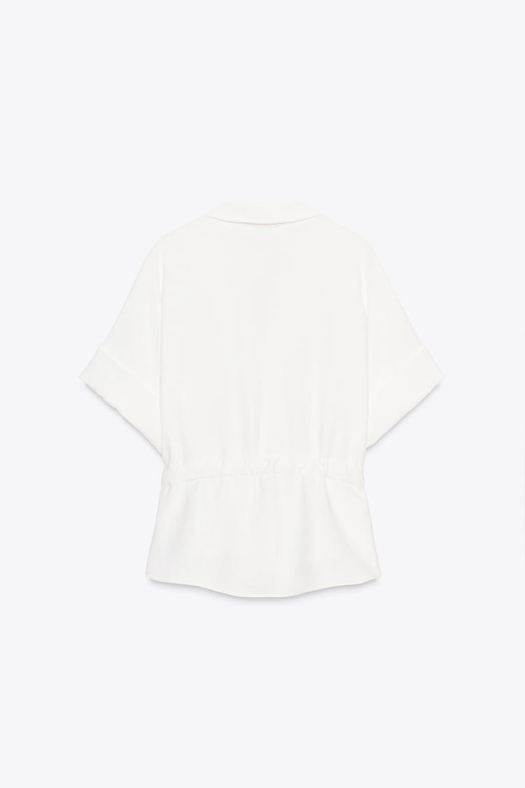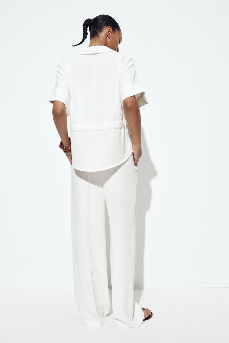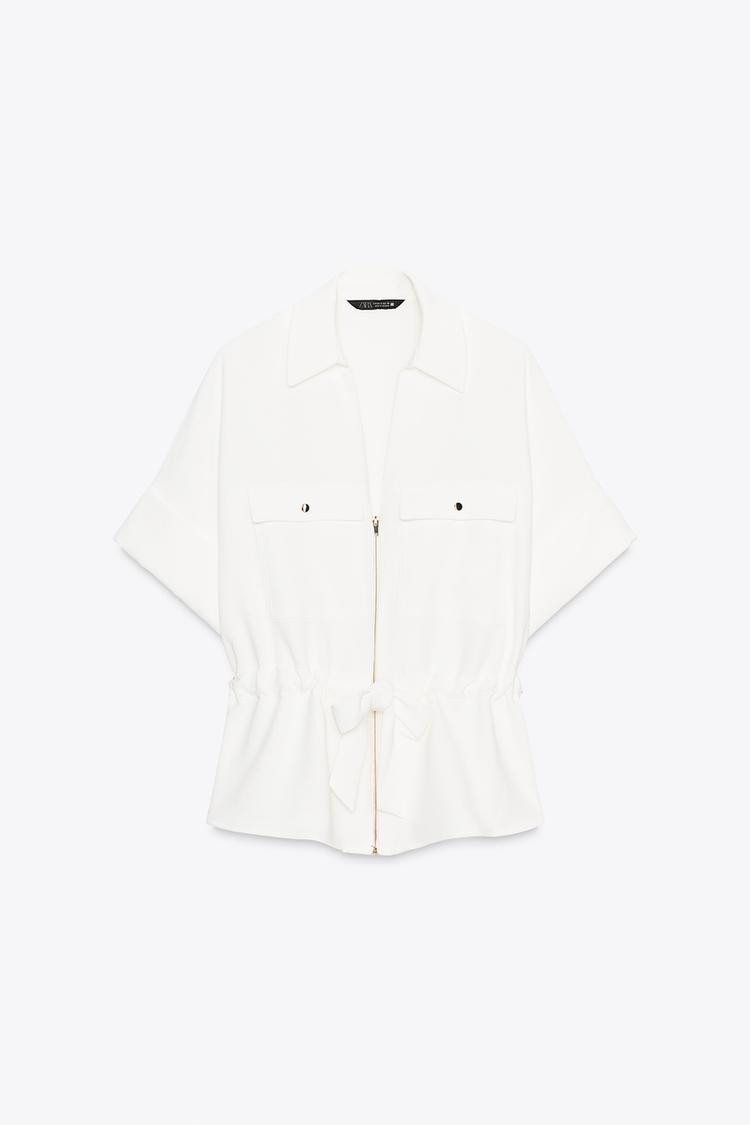 Shirt with a lapel collar, v-neck and short sleeves with turn-up cuffs. Featuring front patch pockets with flaps, a drawstring waist, side vents at the hem and a zip-up front.