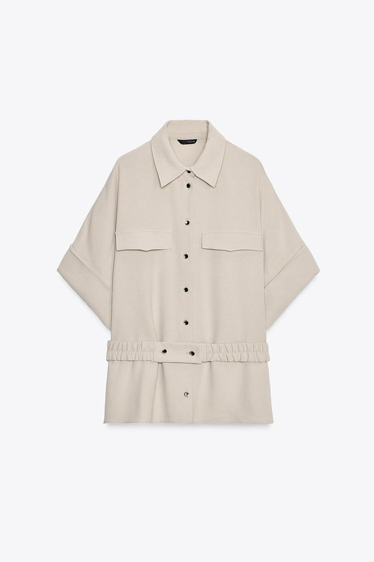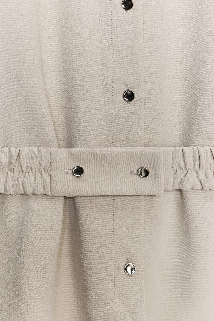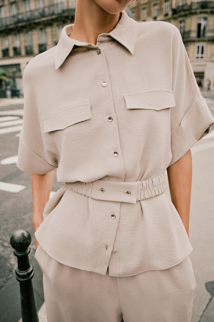 Shirt with a lapel collar and short sleeves with turn-up cuffs. Featuring front pin tuck detail and an elasticated belt with ruching. Button-up front.