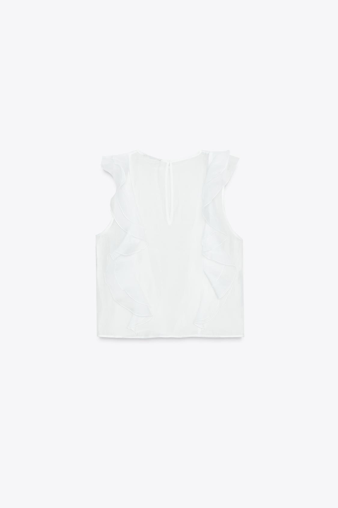 Round neck, sleeveless blouse with ruffle trims. Back fastening with an opening and concealed button.