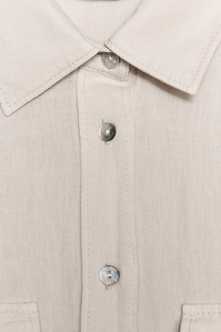 Shirt made from a blend of spun linen and cotton. Features a classic turn-down collar and long sleeves with buttoned cuffs. Designed with flap patch pockets and a rounded, asymmetrical hem. Front button fastening.