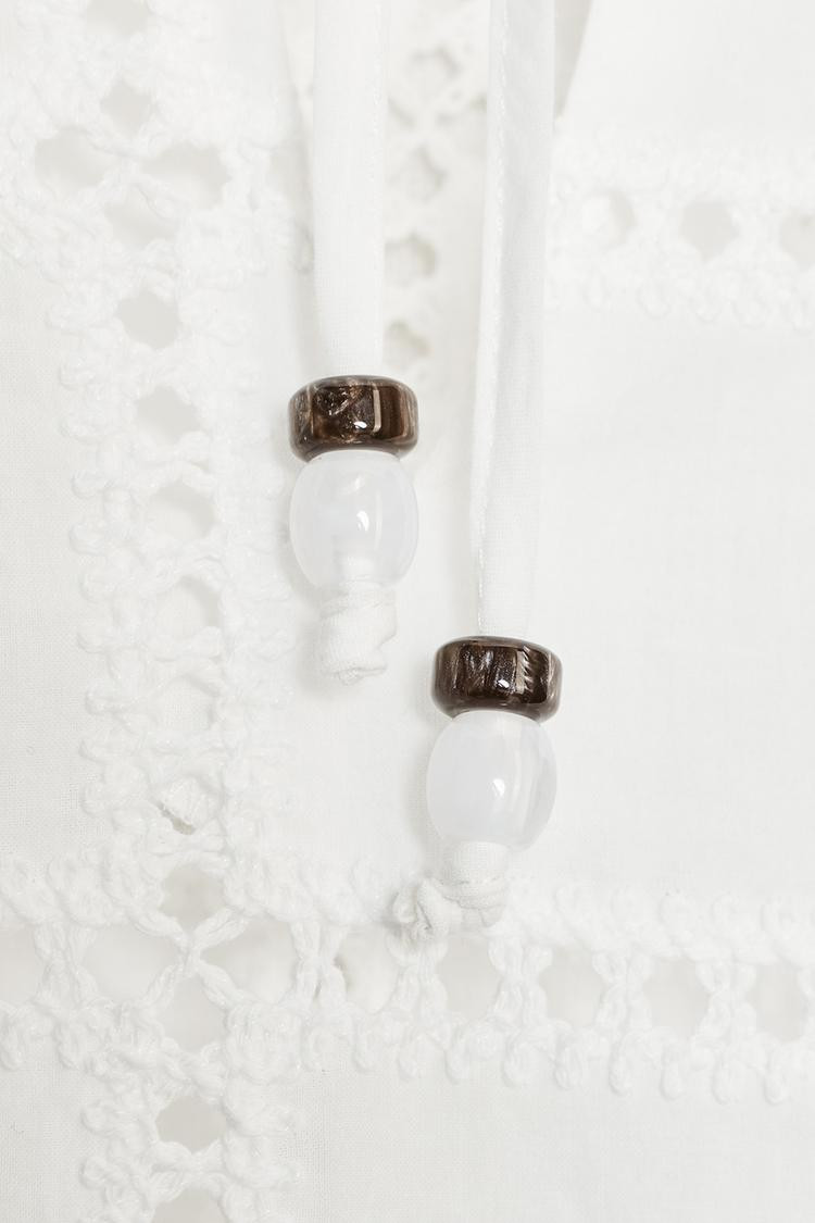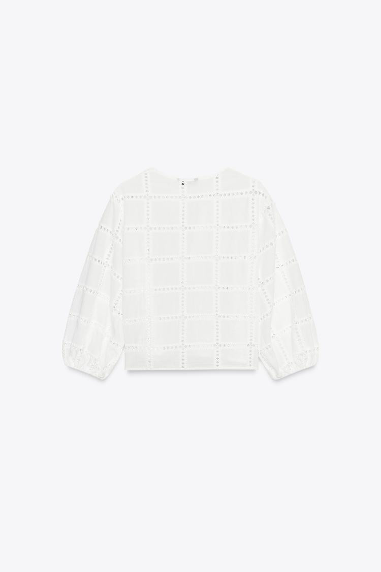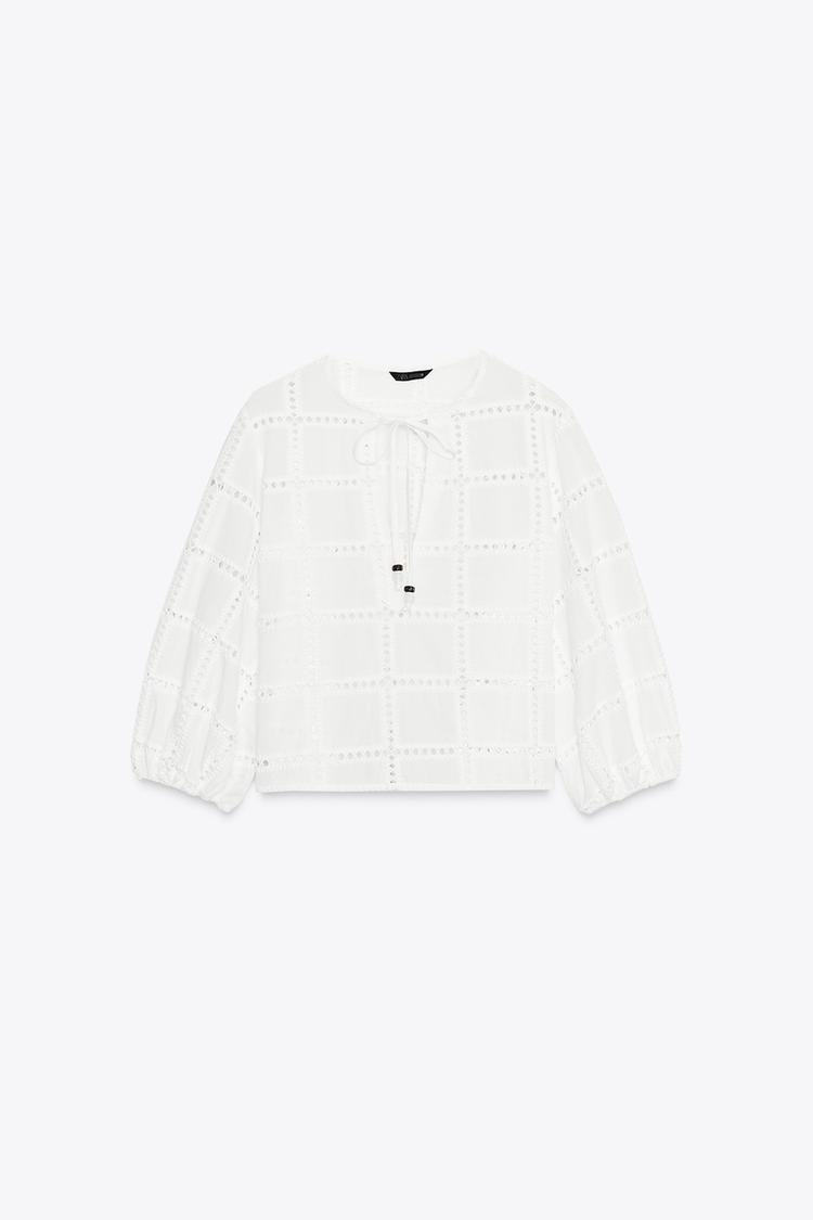 Round neck blouse with drawstring. V-neck and puff sleeves falling below the elbow with elasticated cuffs.