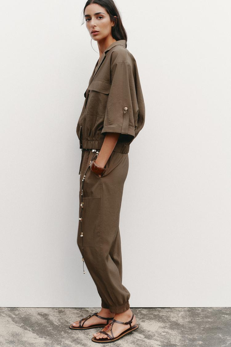 Collared short sleeve shirt with tab and button detail on the turn-up cuffs. Front patch pockets with flaps. Elasticated hem. Front popper button fastening.