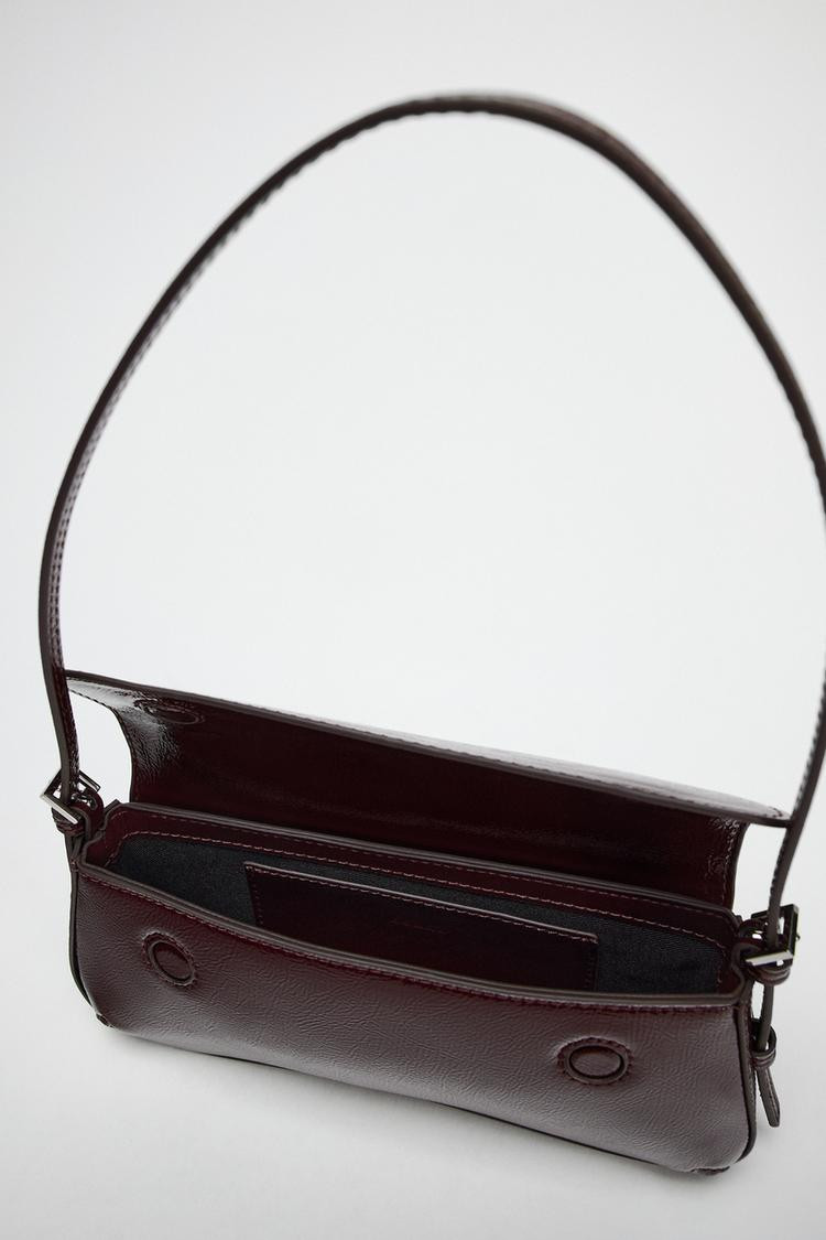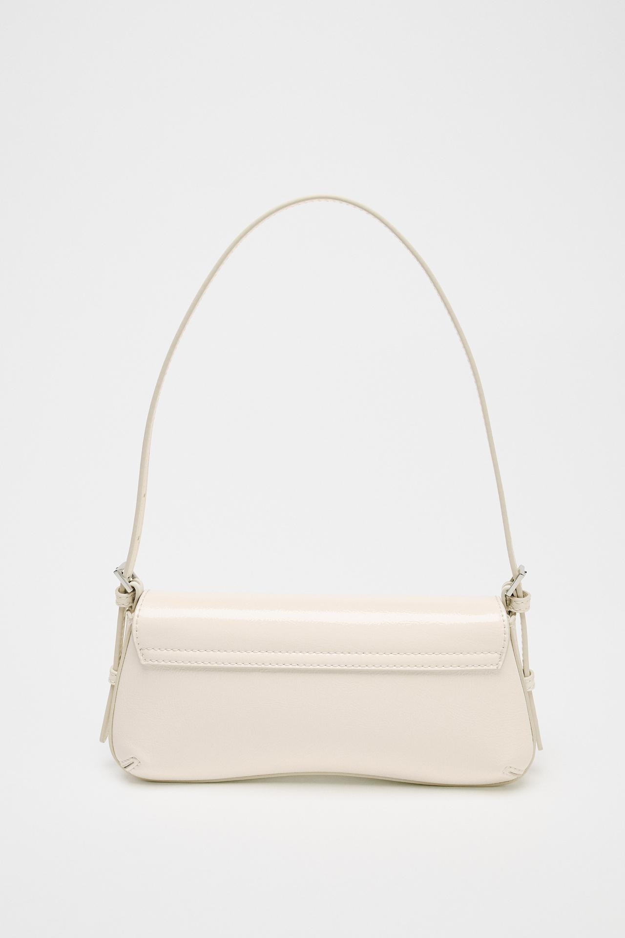 Shoulder bag with flap. Patent effect. Adjustable shoulder strap. Magnetic clasp closure.