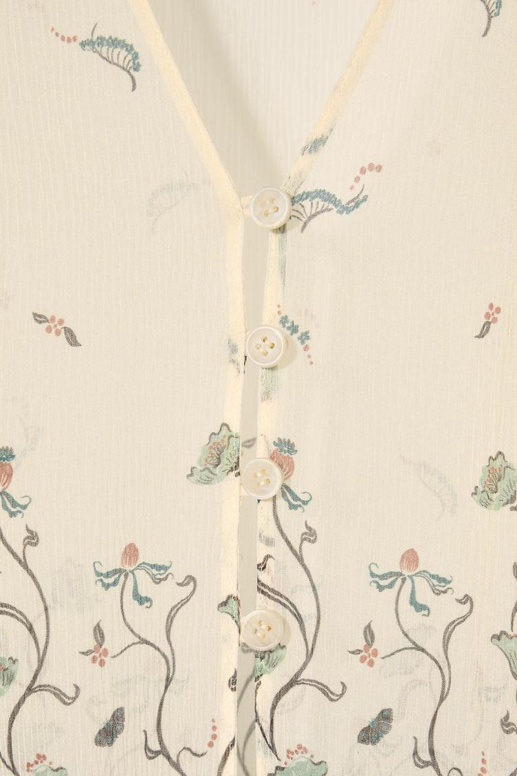 Semi-sheer blouse made from 100% spun silk. V-neck and long sleeves with frill trim. Floral print detail. Button-up front.