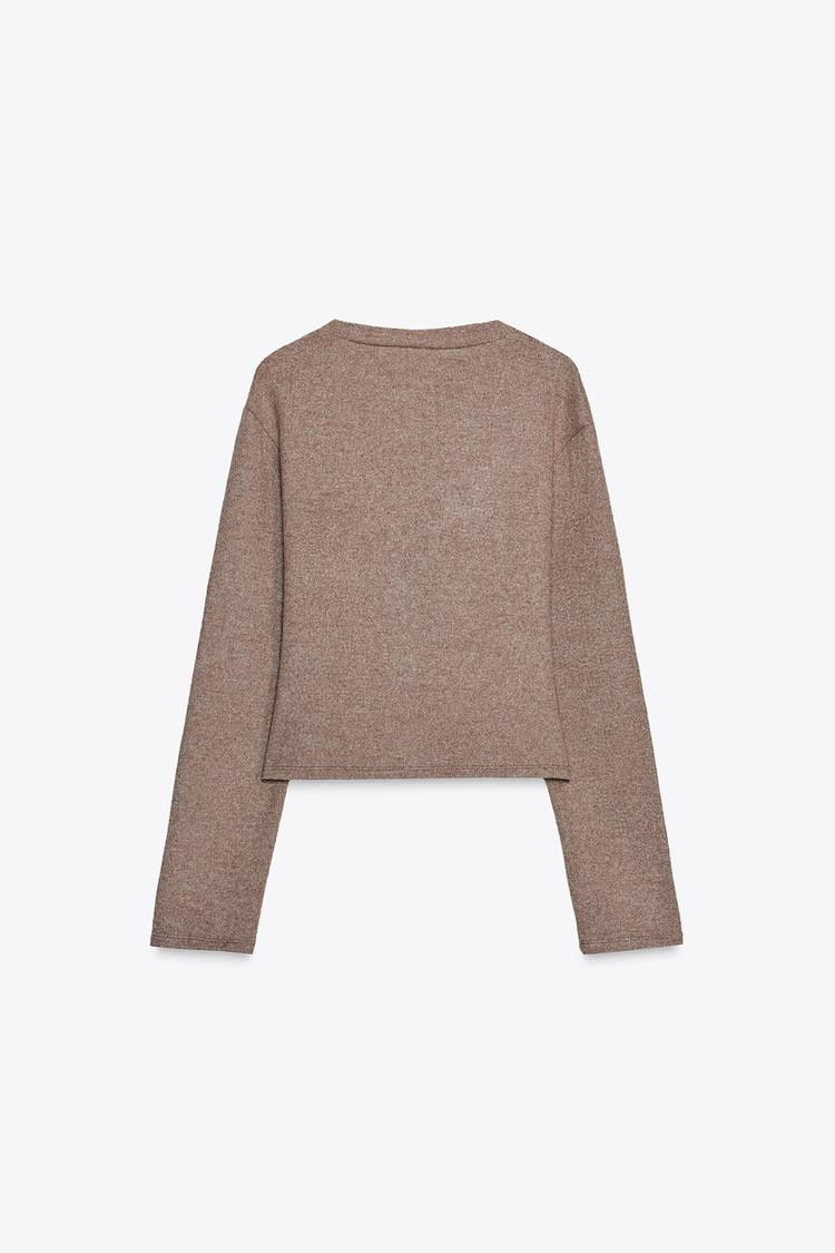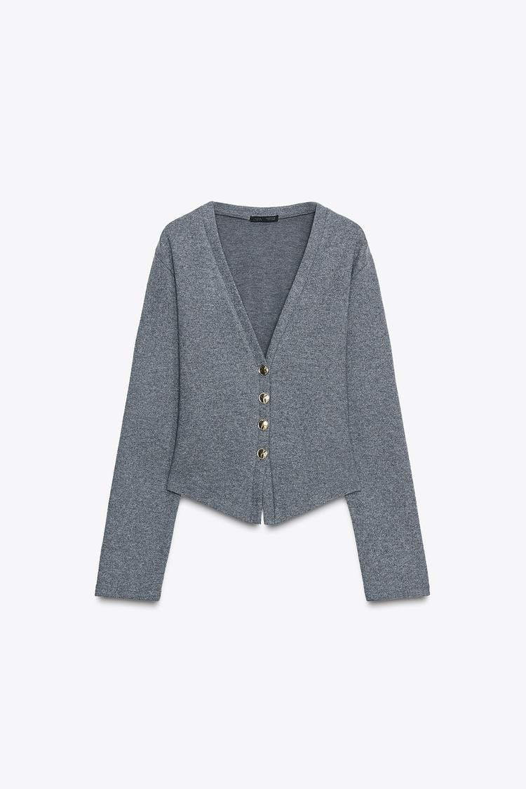 Cardigan crafted from cotton yarn. Featuring a V-neck and long sleeves. Front metal button fastening.