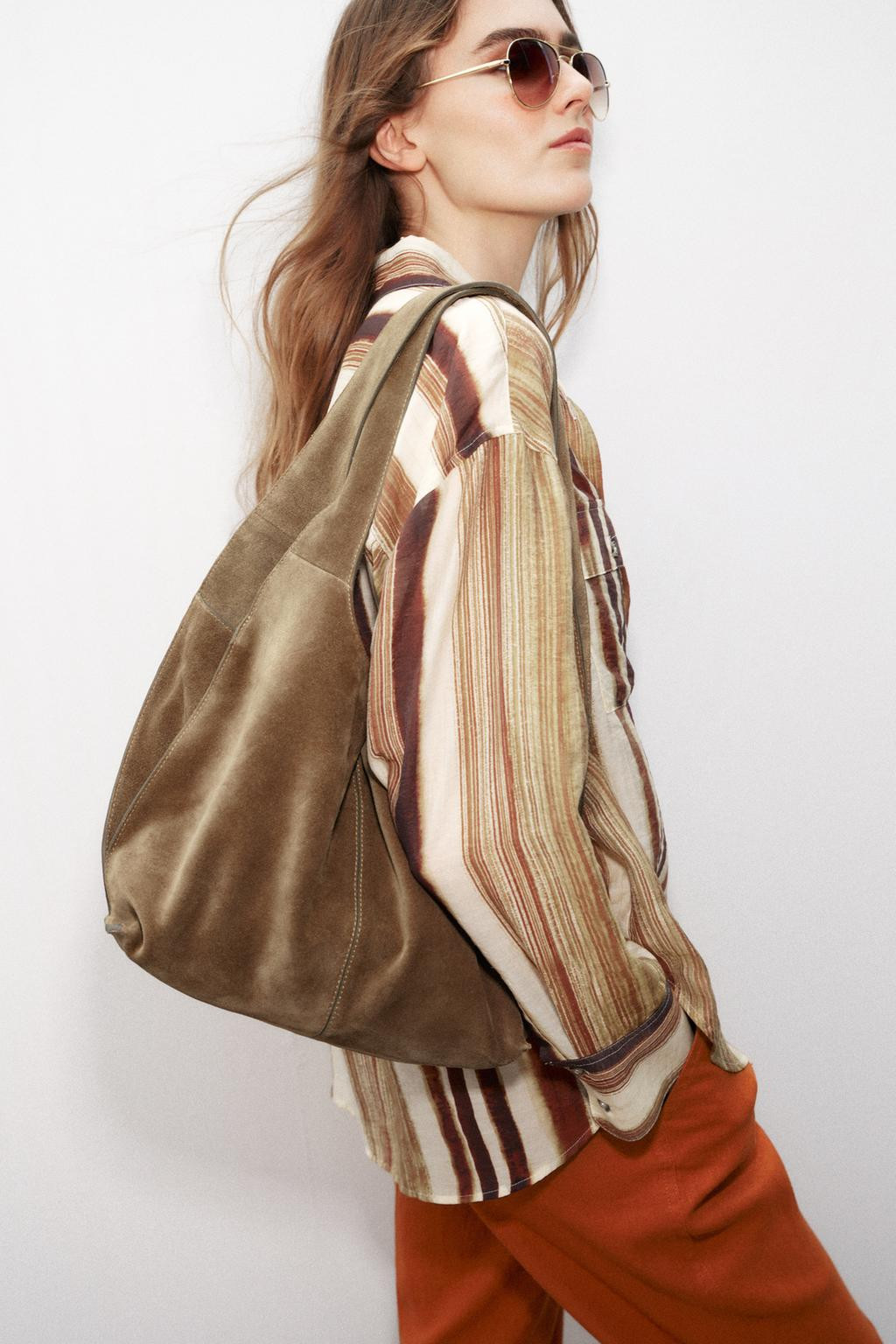 Split suede shoulder bag. Contrast topstitching detail. Interior zipped pocket. Magnetic clasp closure.