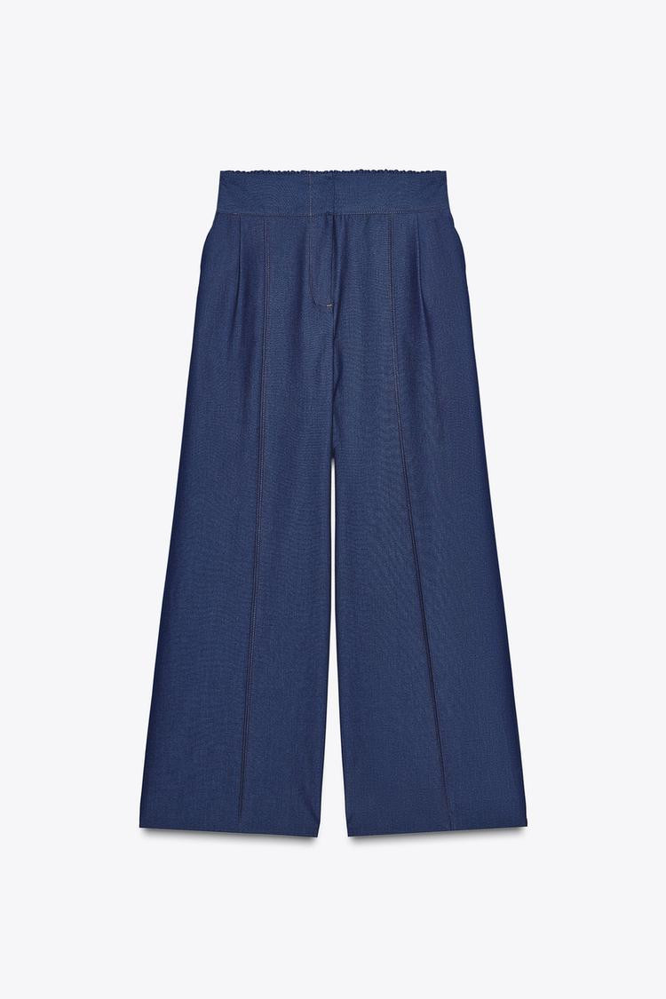 High-waist trousers with elasticated back waistband. Side pockets. Front pleat detail. Front fastening with zip fly, inside button and metal hook-and-eye closure.